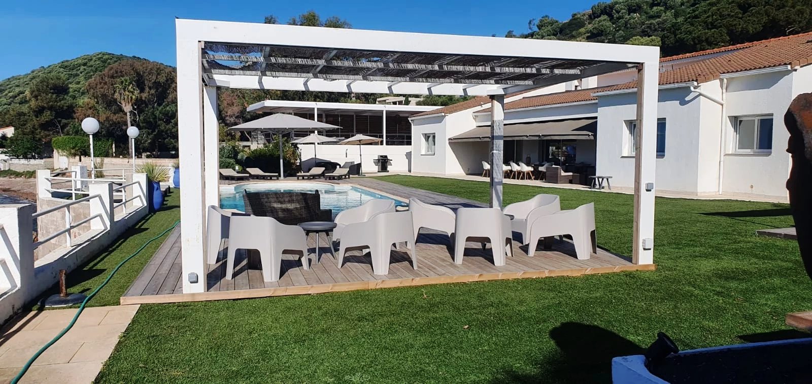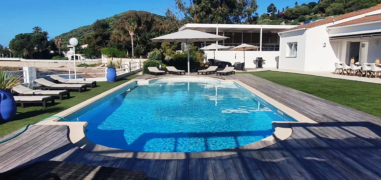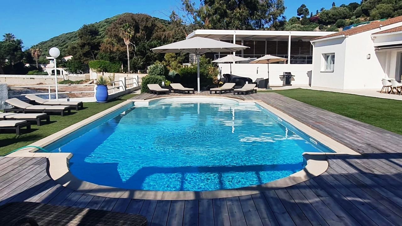 La propriété bénéficie de vastes terrasses aménagées, d’un solarium et d’une magnifique piscine parfaitement intégrée dans son environnement naturel. L’espace extérieur devient un véritable lieu de vie, propice aux réceptions estivales comme aux moments plus intimistes face au coucher de soleil sur les îles.