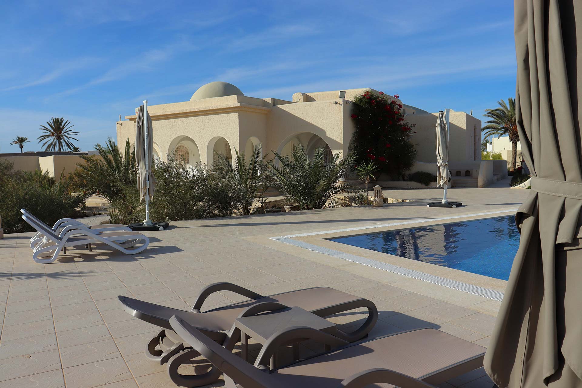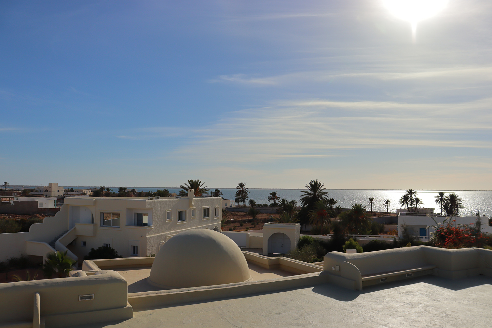 Piscine & rooftop Piscine 12 × 6 m · Vue panoramique Grande piscine de 72 m² et rooftop avec vue panoramique sur la mer et les îlots environnants de Sefnou et Chermedia. Deux espaces d'exception pour profiter de Kerkennah en toutes saisons.
