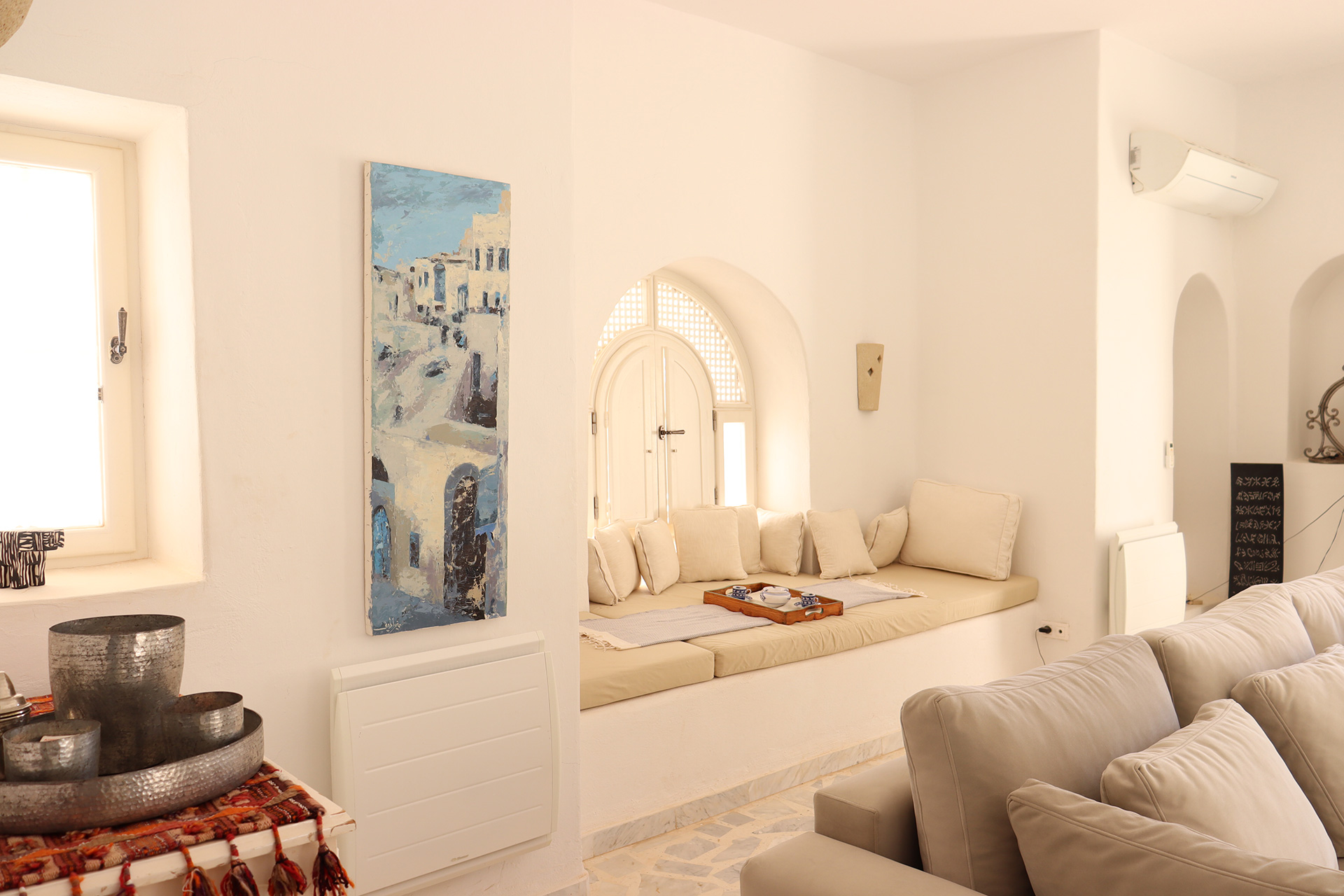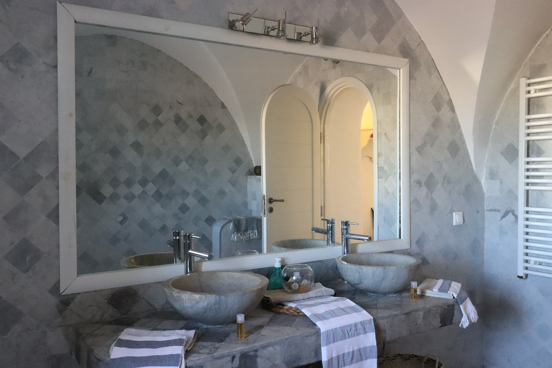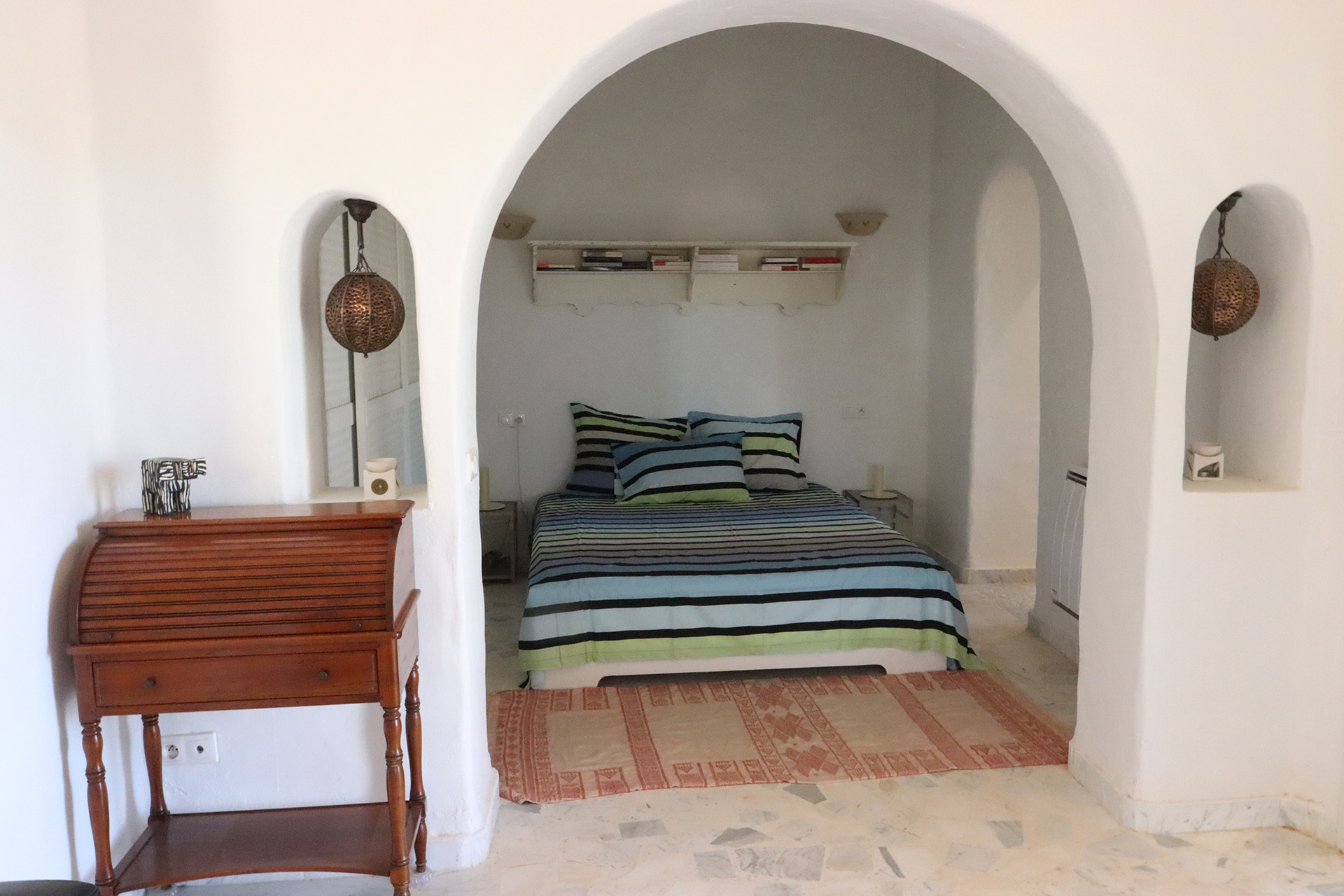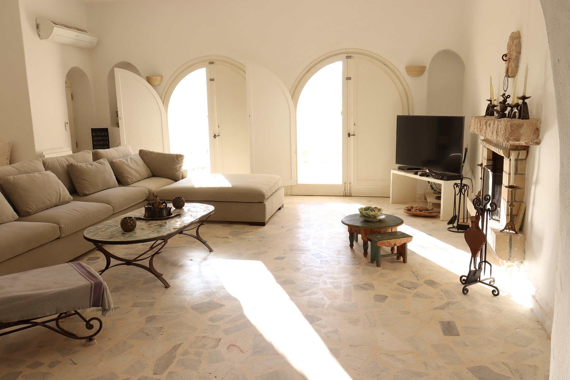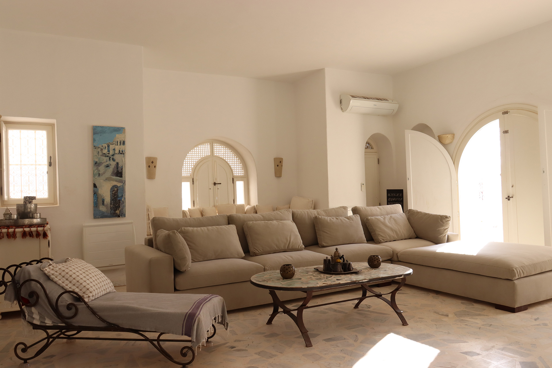 La villa principale développe 320 m² d'espaces généreux et lumineux, organisés pour offrir le maximum de confort à ses occupants. Elle regroupe trois suites luxueuses, chacune dotée de sa propre salle de bain, d'un coin cuisine-frigo et d'une terrasse privative avec vue sur le jardin ou la mer. Le cœur de la villa est constitué d'un grand espace de vie — salon avec cheminée, salle à manger, cuisine équipée — ouvert sur les terrasses et la piscine. L'architecture kerkennienne traditionnelle est sublimée par des finitions contemporaines de qualité : marbre, douches à l'italienne, matelas à mémoire de forme, TV 4K grand format. Le rooftop, accessible depuis la villa, offre une vue panoramique époustouflante sur la mer, les îlots de Sefnou et Chermedia et les paysages plats et préservés de l'archipel. Un espace de vie extérieur d'exception, particulièrement saisissant au coucher du soleil. Équipements Villa Principale