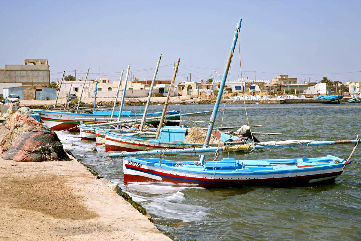 À 20 kilomètres au large de Sfax, dans le golfe de Gabès, l'archipel de Kerkennah forme un monde à part — une constellation d'îles plates et préservées où le temps semble suspendu. Deux îles principales habitées, Gharbi et Chergui, reliées par une voie millénaire qui existait déjà à l'époque romaine. Une population de 15 000 habitants fière de ses racines, attachée à ses traditions et à la mer qui les nourrit depuis toujours. Kerkennah est connue des amoureux de la Méditerranée authentique pour la transparence exceptionnelle de ses eaux — peu profondes, turquoise, d'une douceur rare — et pour la qualité de sa lumière. Ici, pas de tourisme de masse, pas de béton. Des palmiers, des oliviers, des felouques voguant à voile sur un horizon sans fin. La pêche est au cœur de l'identité kerkennienne. La technique ancestrale de la Charfia — pièges fixes en hauts-fonds, remontant à l'Antiquité — se perpétue de génération en génération. Au lever du soleil, les pêcheurs sortent relever leurs casiers sur leurs felouques à voile. Ce spectacle quotidien, offert gratuitement depuis votre terrasse, n'a pas de prix.