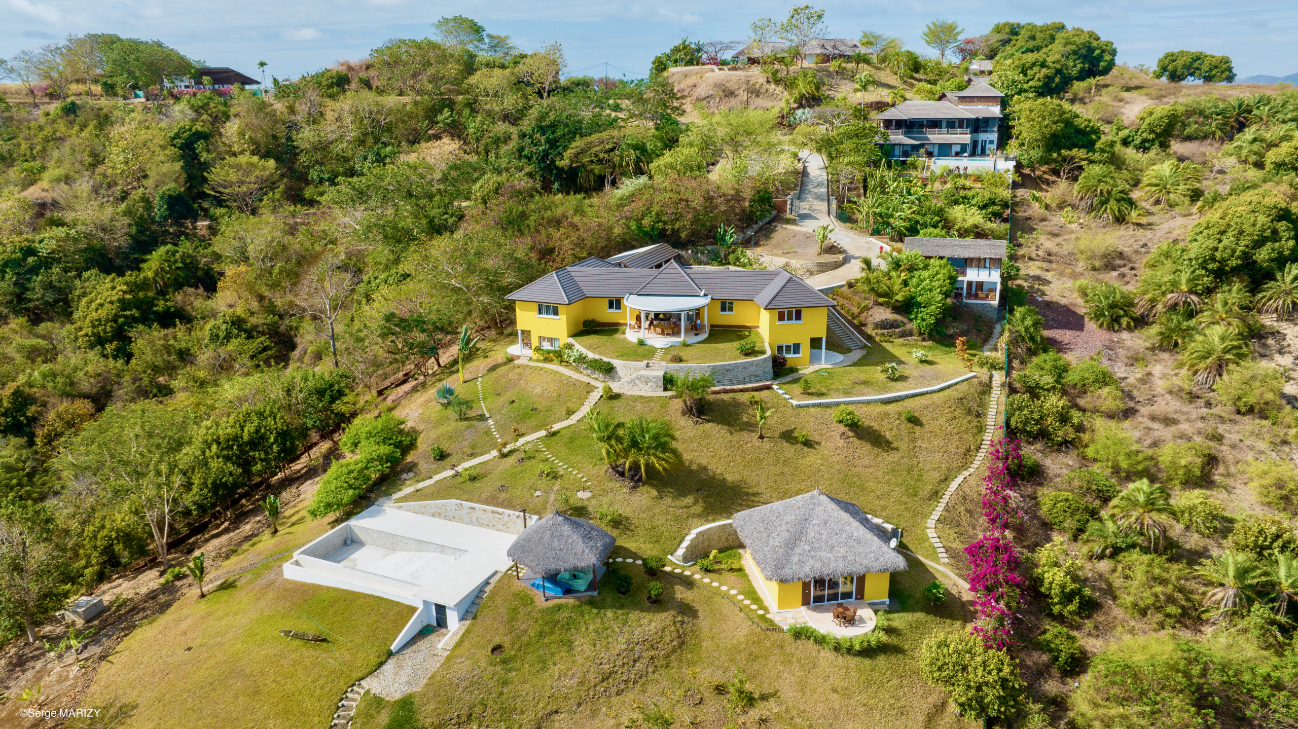 Villa de prestige de 474 m² sur 5 021 m² de terrain paysager, en position dominante au cœur du domaine Cap Doré — vue panoramique 180° sur la baie d'Andilana et l'océan Indien, piscine à débordement 11×5 m, 5 chambres en suite, autonomie totale solaire et hydraulique, dépendances personnel, garage 4 véhicules.