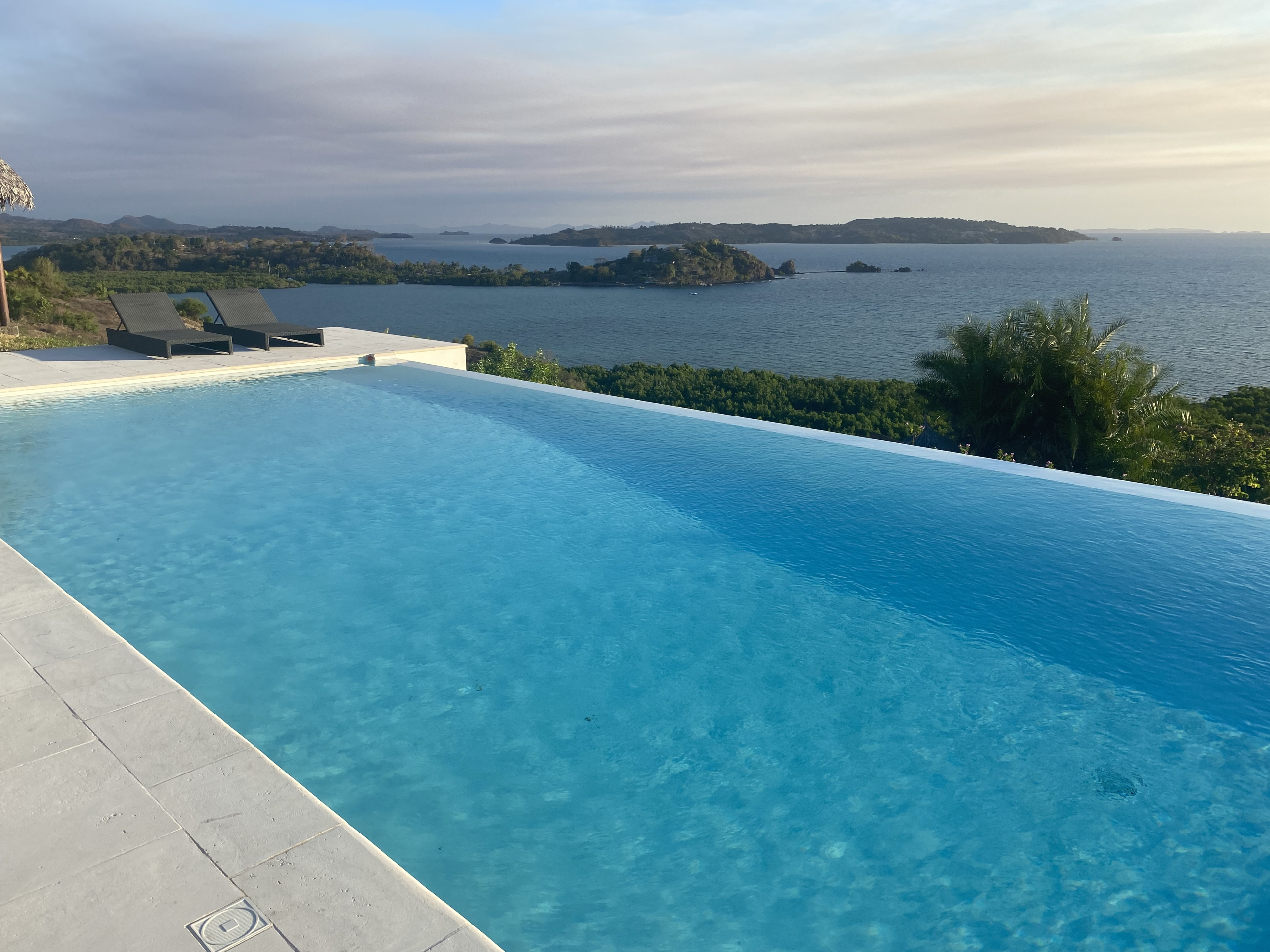 Villa panoramique de 474 m² perchée sur les hauteurs du domaine Cap Doré — vue 180° sur la baie d'Andilana et l'océan ouvert, piscine à débordement, autonomie totale.