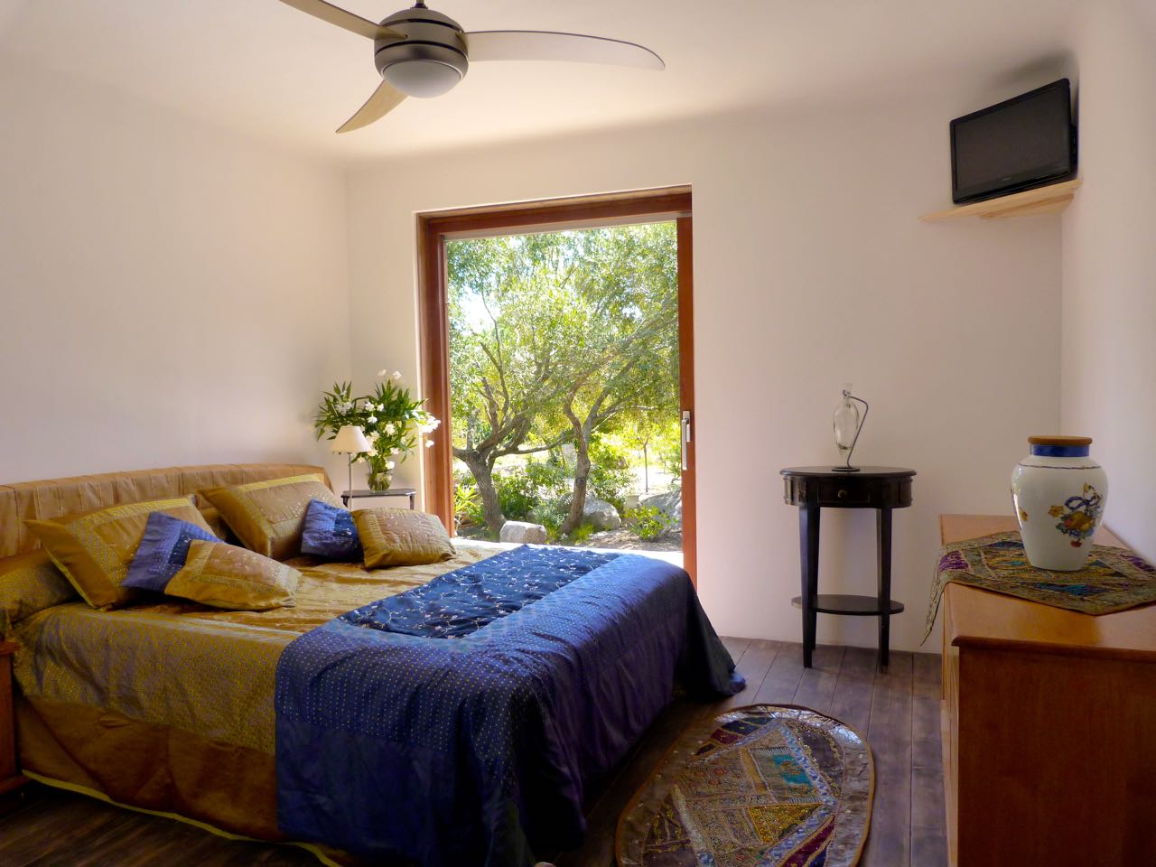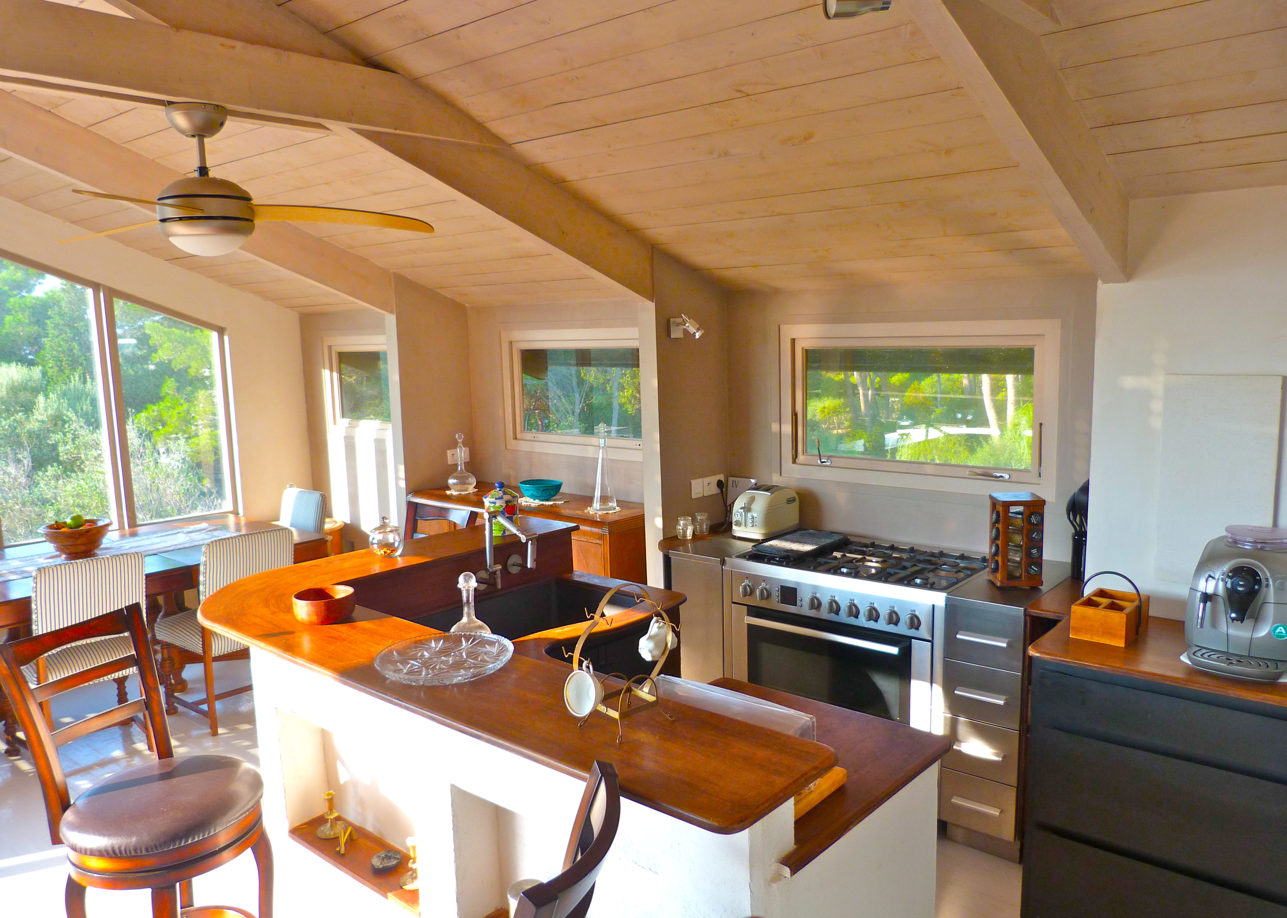 The concrete structure is clad in Premium Knotty Red Cedar , a wood prized for its durability and aesthetic appeal. Inside, solid oak floors, sliding glass doors, and louvered doors contribute to a warm, elegant atmosphere that perfectly complements the spirit of the place.