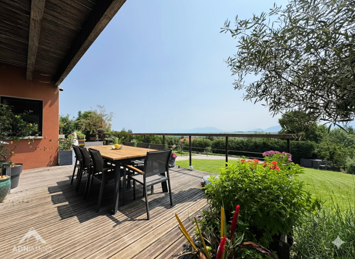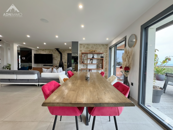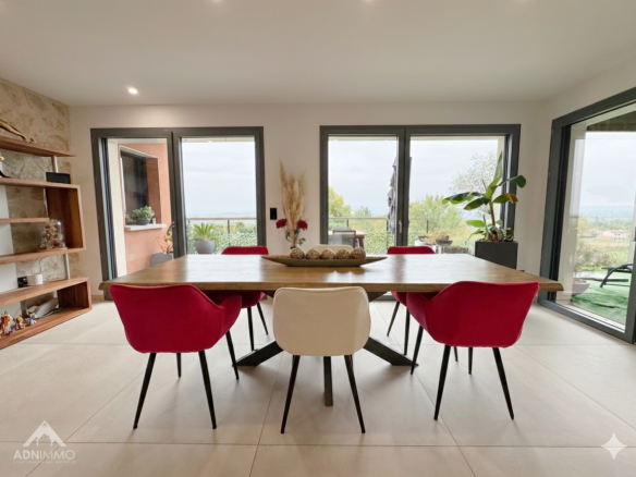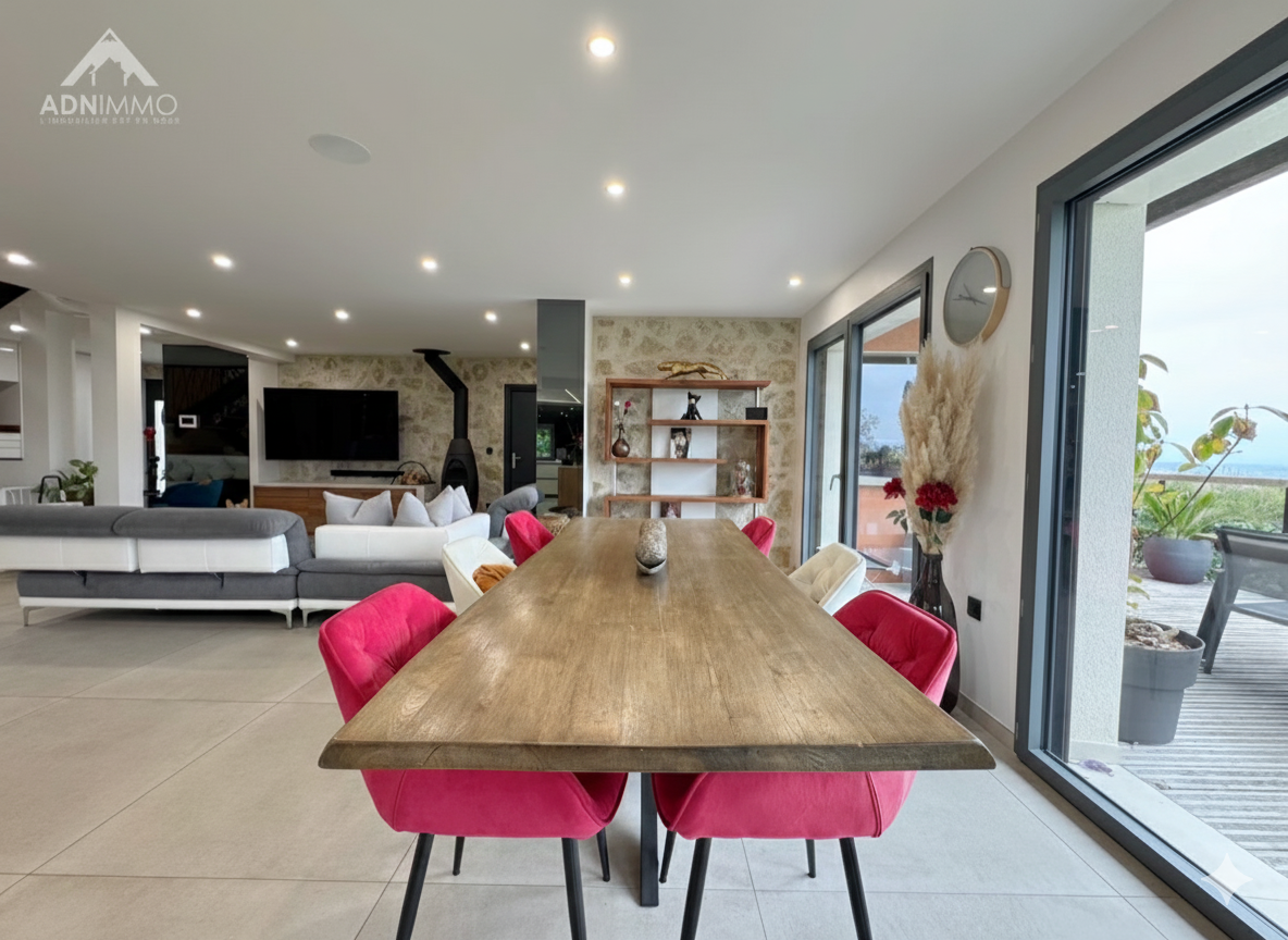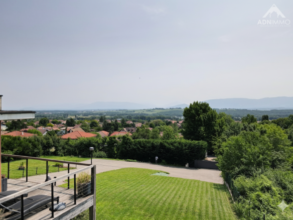 ADN Immo agency exclusively presents this superb 375 sq m property in the commune of Thoiry. Built on a 1419 sq m plot, it comprises a vast, bright living space including a fully equipped open-plan kitchen, 6 spacious bedrooms (5 of which are suites), an office, a bathroom, 5 shower rooms, and WCs. Additional features include a gym, a games room, a spa area with showers and changing rooms, garages, and several south-facing terraces offering breathtaking views of the Alps and Mont Blanc.