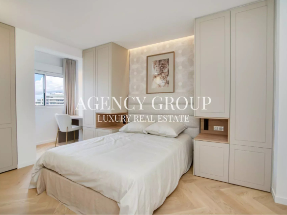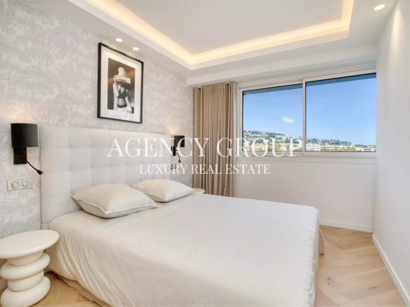 Located in a prestigious residence on the Croisette, 200 meters from the beaches and opposite Port Canto, discover this fully renovated 4-room apartment of 95m2. It benefits from a 12 m² southwest-facing terrace with an unobstructed view of the park, the sea and the mountains.
