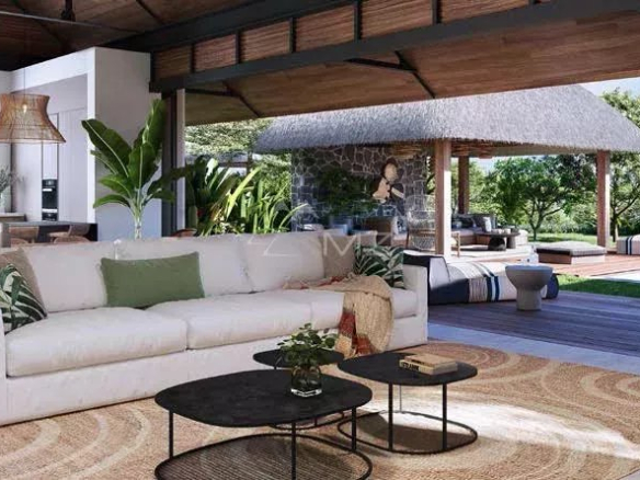 This magnificent villa enjoys a dual north-south exposure along the prestigious Palm Alley. Throughout the day, natural light floods the living spaces, creating a warm and inviting atmosphere. Inspired by the veranda living concept typical of Mauritian architecture, it offers a large central space that serves as a living room, dining room, and kitchen, providing direct access to the outdoors and the beautiful swimming pool. The gabled roof, characteristic of the island, ensures optimal air circulation and enhances this feeling of spaciousness. The organic materials used, such as the grey stone walls with traditional white string joints, the roofing, and the sun and rain awnings, create a rustic and authentic ambiance. The bedrooms, equipped with large bay windows, offer comfortable and airy spaces for peaceful nights. This villa also offers a room that can be used as an office or TV room, or potentially converted into a fourth en-suite bedroom (optional).