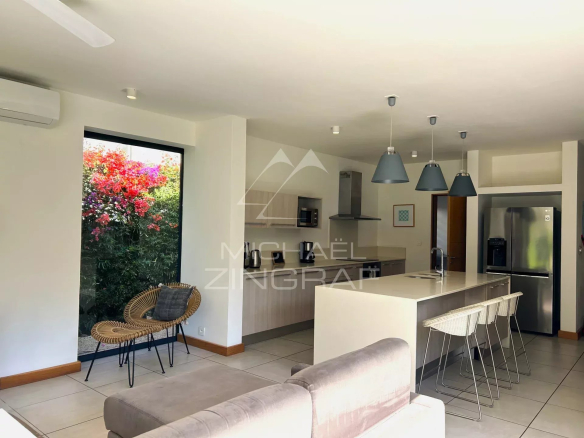 Spacious and bright living areas, featuring high-end materials and equipment. Large windows opening onto a landscaped garden with a distinctly tropical ambiance.