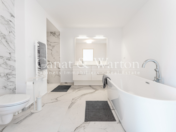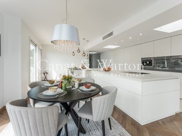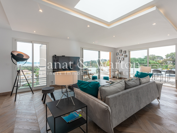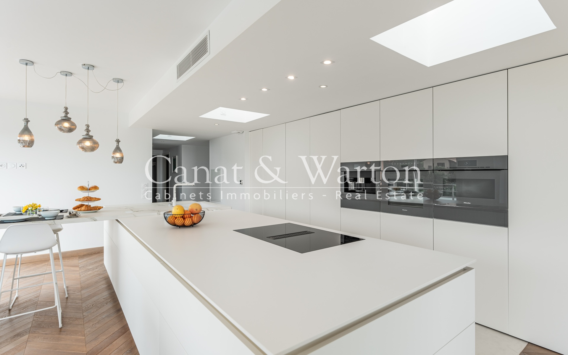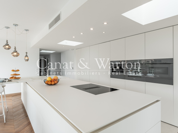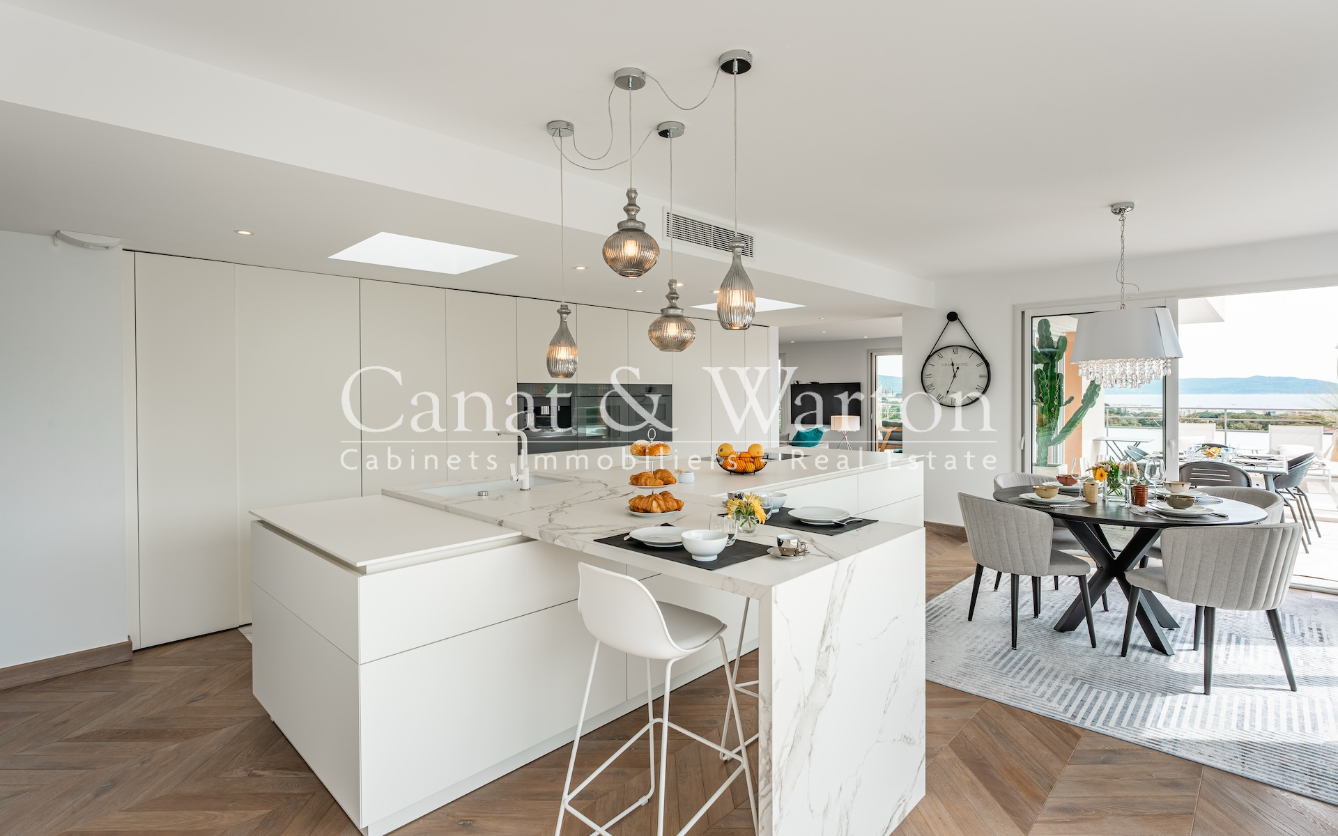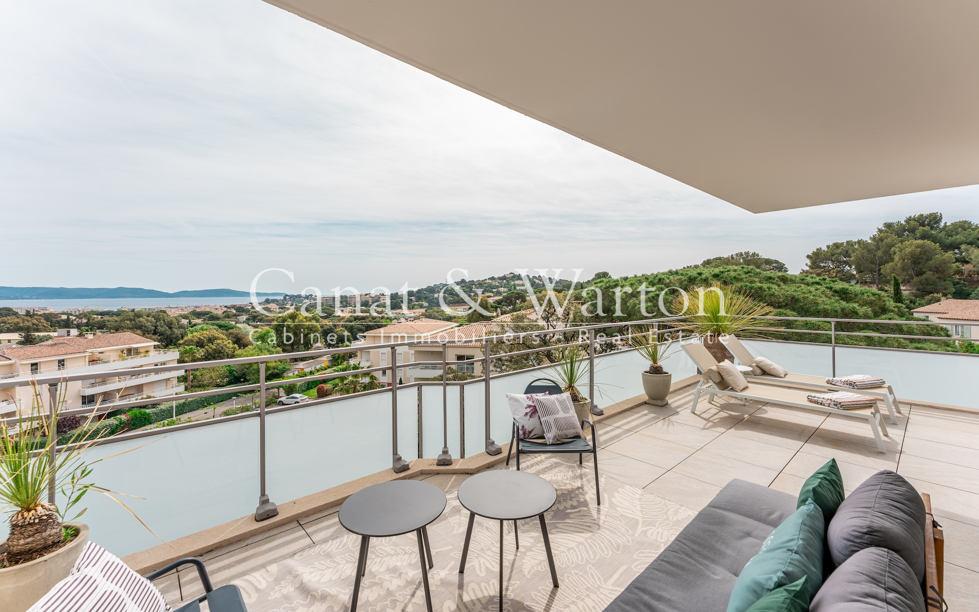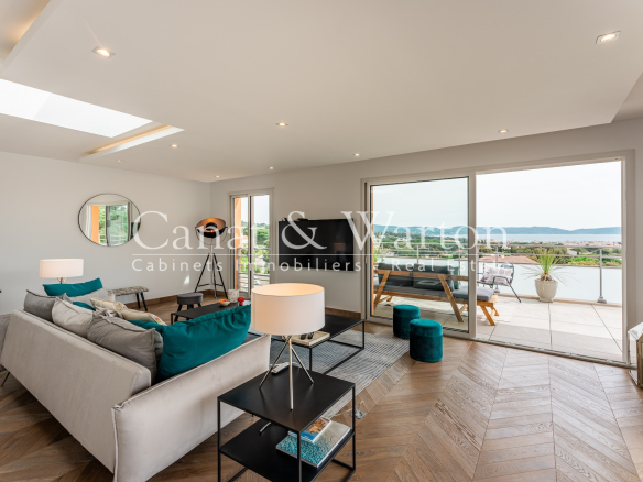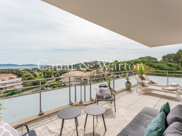 CANAT & WARTON Golfe de Saint Tropez presents this magnificent 3-bedroom apartment in Cavalaire, located on the top floor with sea views. Ideally situated in a recent 2021 residence, this penthouse offers 147.05 sq m of living space (Carrez Law) with a terrace of approximately 60 sq m boasting multiple exposures. High-end amenities throughout. It comprises an entrance hall, a living/dining room/fully equipped open-plan kitchen totaling approximately 70 sq m, a master bedroom of over 30 sq m with en-suite bathroom and WC, two further bedrooms, and a shower room and WC. Two garages complete this exceptional property. Rebecca SCHMITT (EI), a sales agent registered with the RSAC under number 440537033 and specializing in apartments at the CANAT & WARTON Golfe de Saint Tropez agency, is available at +33 7 88 48 30 57. We speak English. Information on the risks to which this property is exposed is available on the Géorisques website: www.georisques.gouv.fr