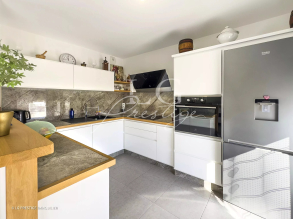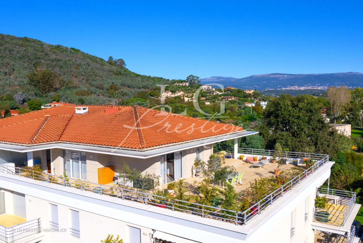 It offers a bright living space with an open-plan kitchen, three comfortable bedrooms, and two refined bathrooms. The terrace, spanning over 140 m², invites you to enjoy panoramic views of the surrounding greenery and hills. For added convenience, you benefit from a large underground parking space and an additional outdoor parking space. Ideally situated close to all amenities, this property embodies a modern and functional lifestyle.