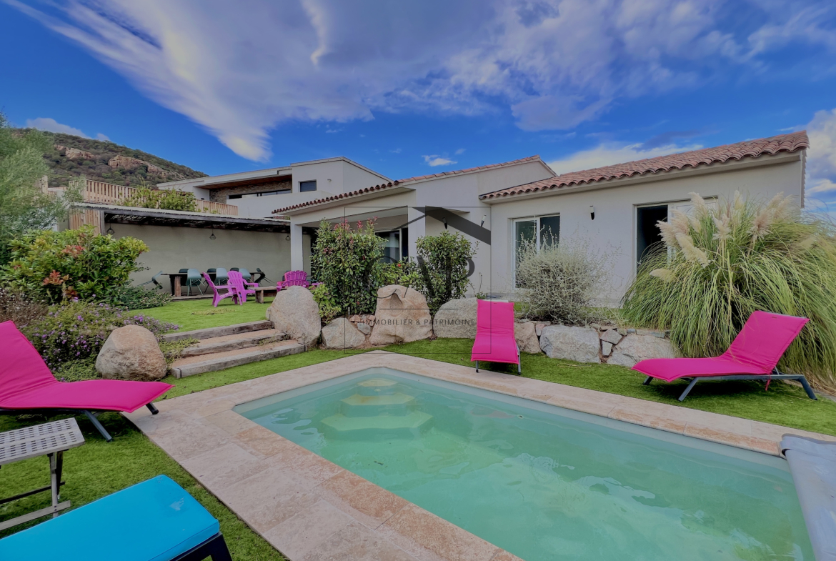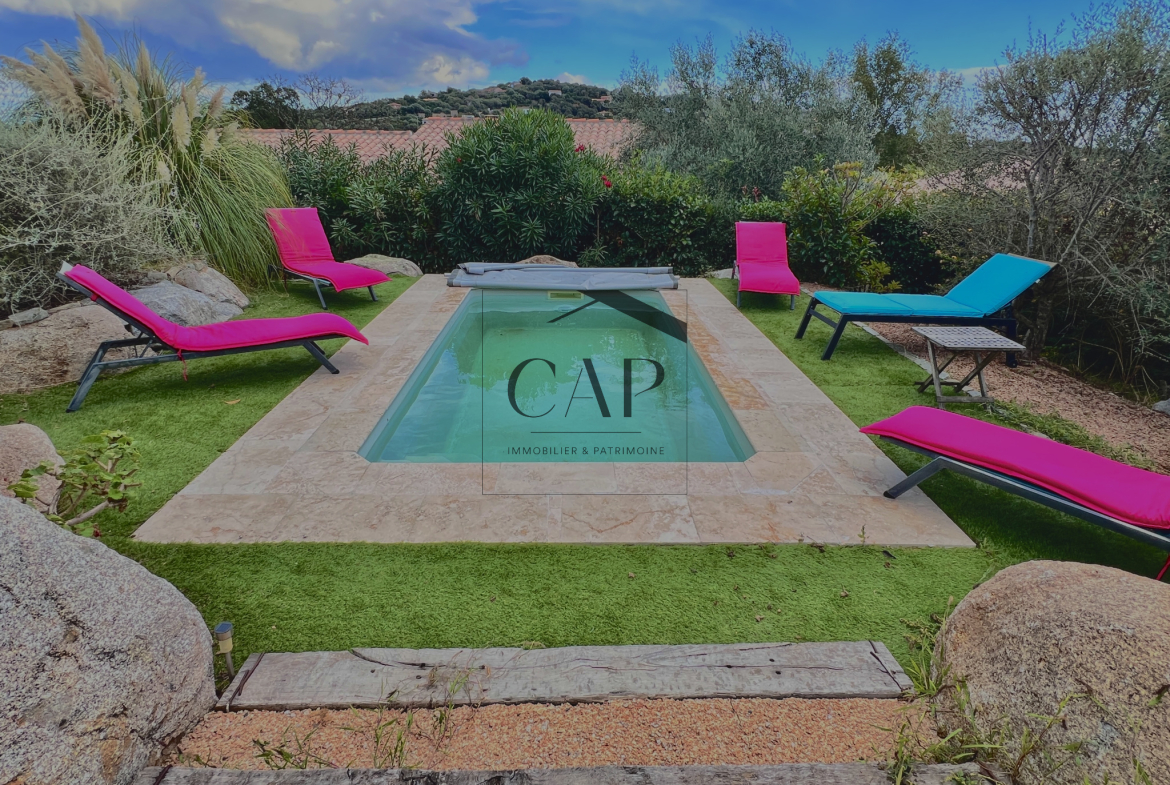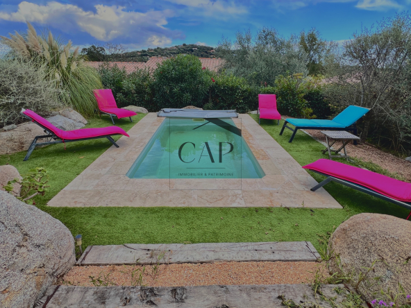 Only 3 km from the beaches of Pinarello and Saint-Cyprien, 12 km from Porto-Vecchio. Heated salt-water swimming pool with safety cover. Tiled and wooden terrace, pool house, enclosed landscaped garden. Quality materials: reinforced insulation, aluminum joinery with electric roller shutters. Compliant RT 2012, reduced notary fees and building damage insurance included.
