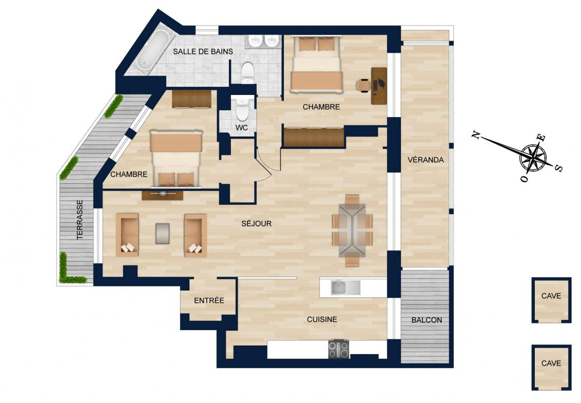 The 31 sq m living room with dual aspect and high ceilings, the 12 sq m eat-in kitchen, and the 12.45 sq m garden-veranda provide unique living spaces. Two bright bedrooms, a private terrace, a full bathroom, and ample storage complete this property. Located