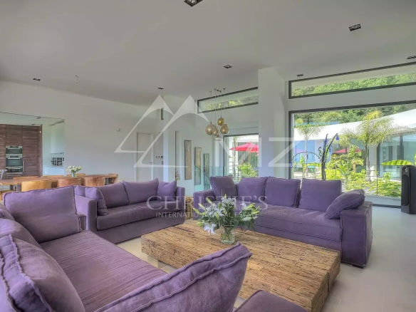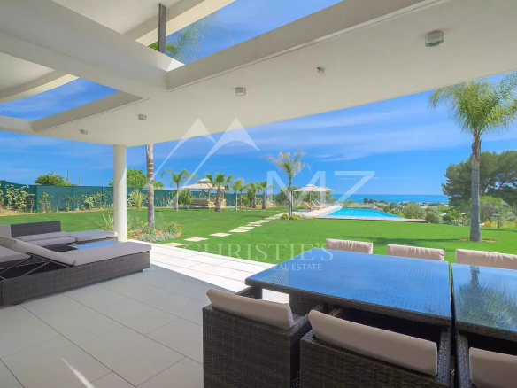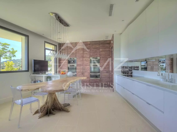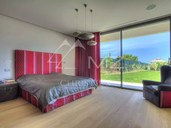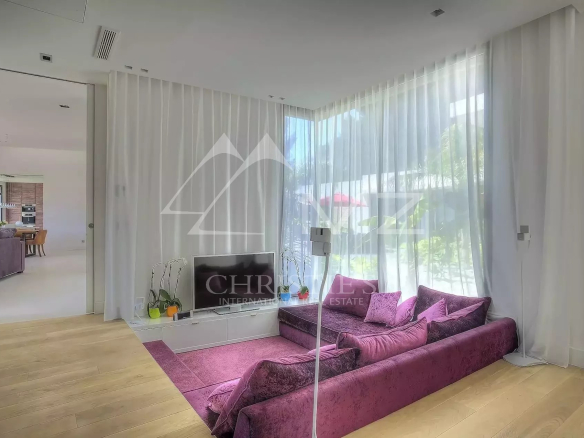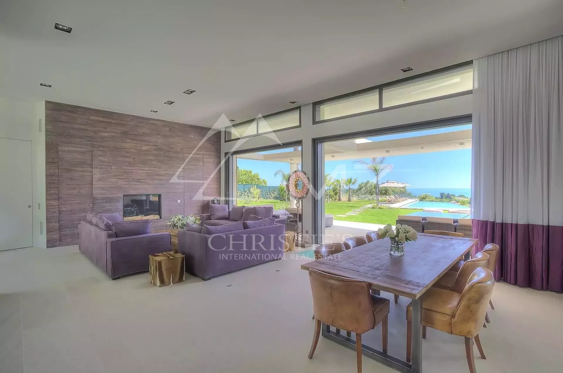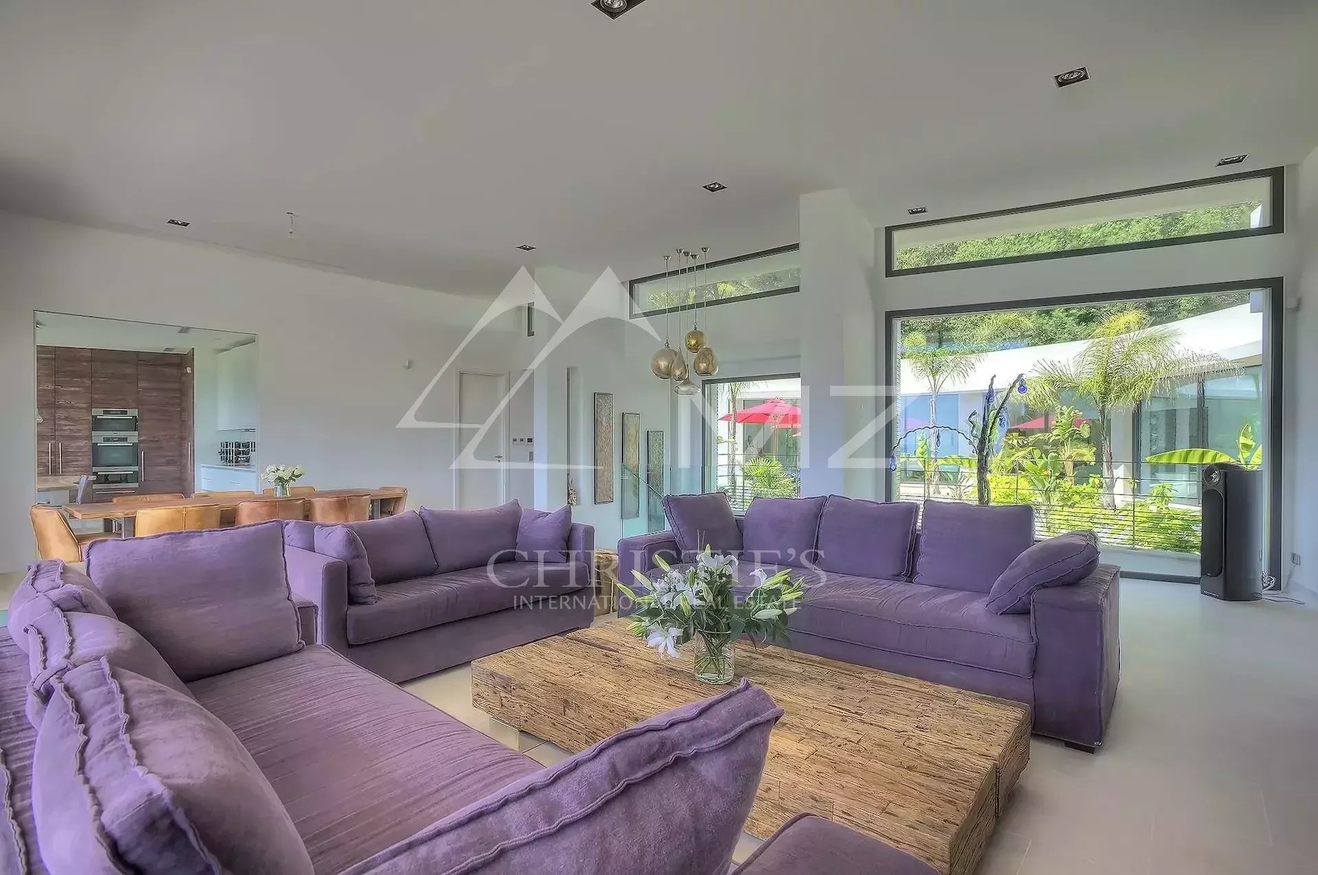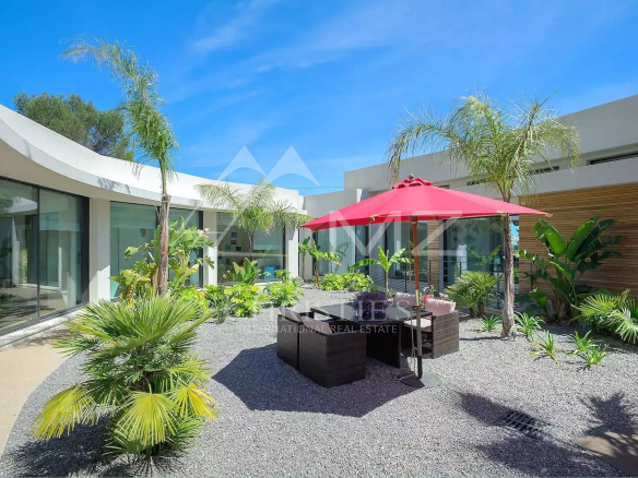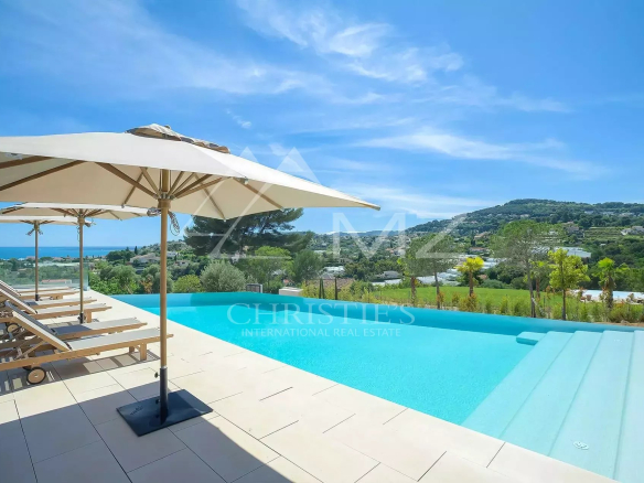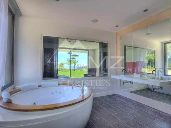 Stunning new Californian-style villa of approximately 500 sq m, comprising: a living room with dining area and views of the Cap d'Antibes bay, a fully equipped kitchen, an office, a lounge, a master bedroom with dressing room and whirlpool bathroom, two bedrooms with shower rooms, a bedroom with bathroom, two children's bedrooms and a shower room. On the mezzanine level, a games room, a 14-seat cinema, a pantry, a wine cellar and a laundry room. A studio apartment with kitchen, living room, bedroom and shower room. Heated infinity pool. 3-car garage. 8000 sq m plot.