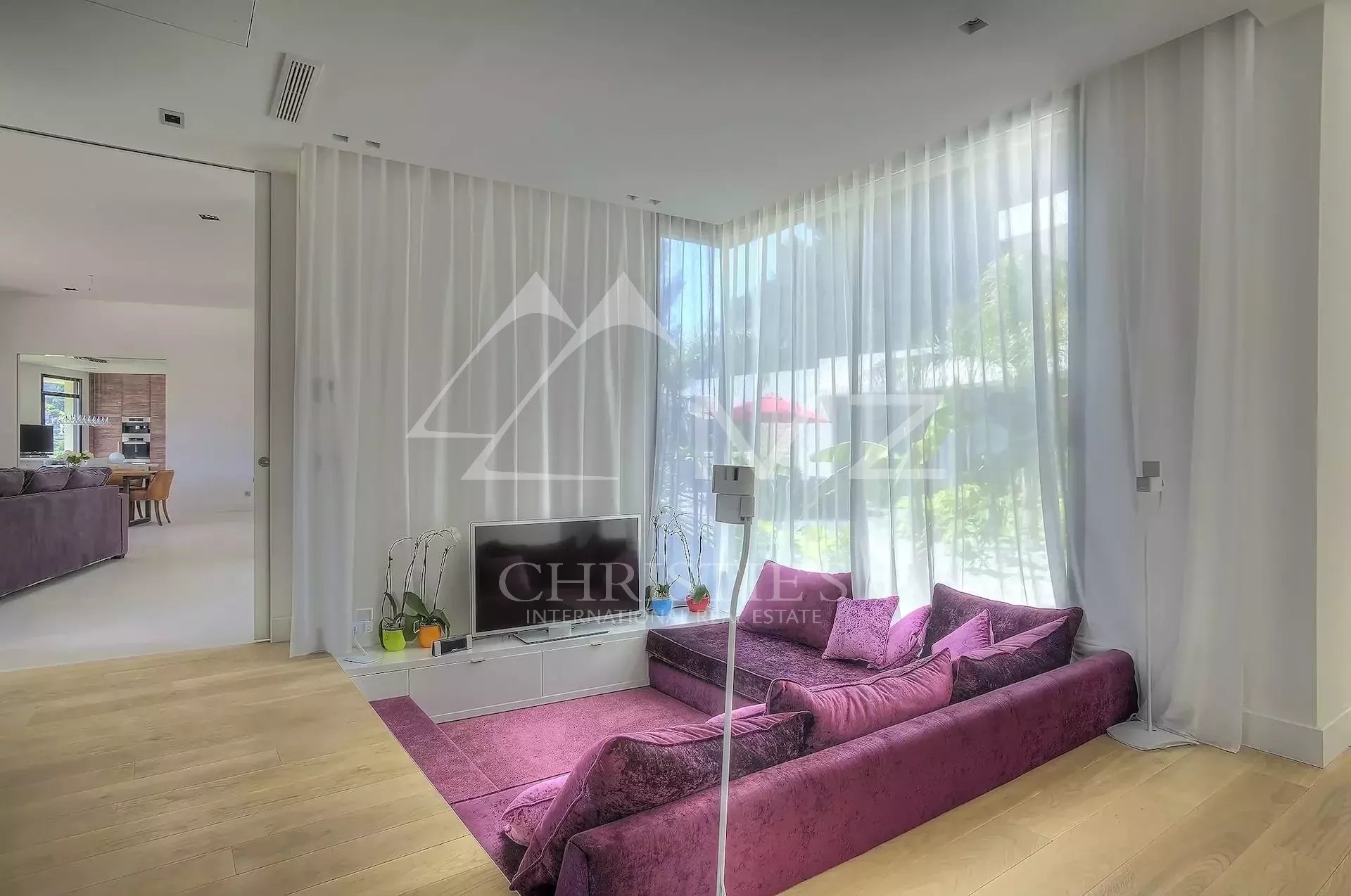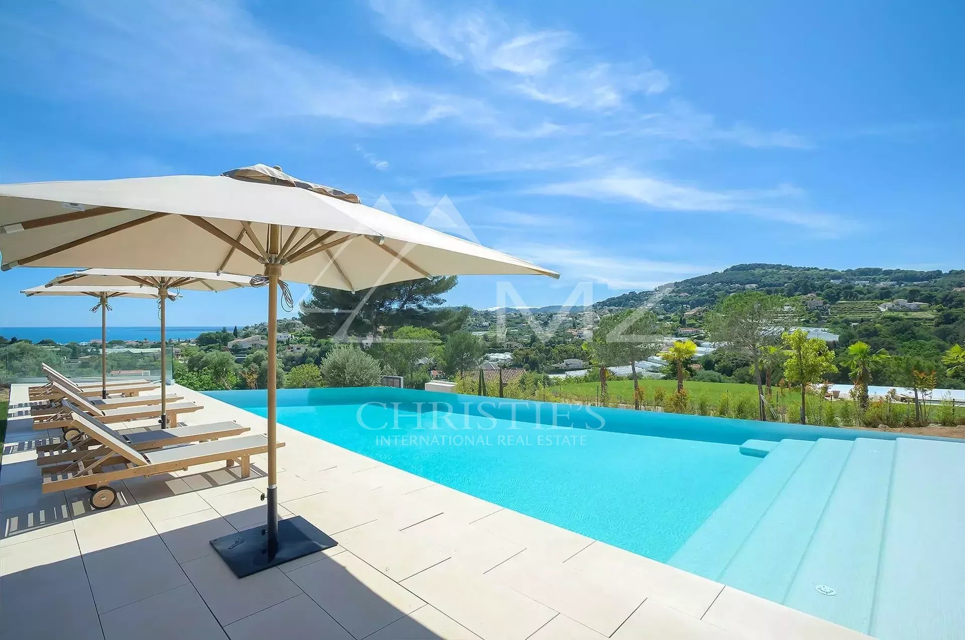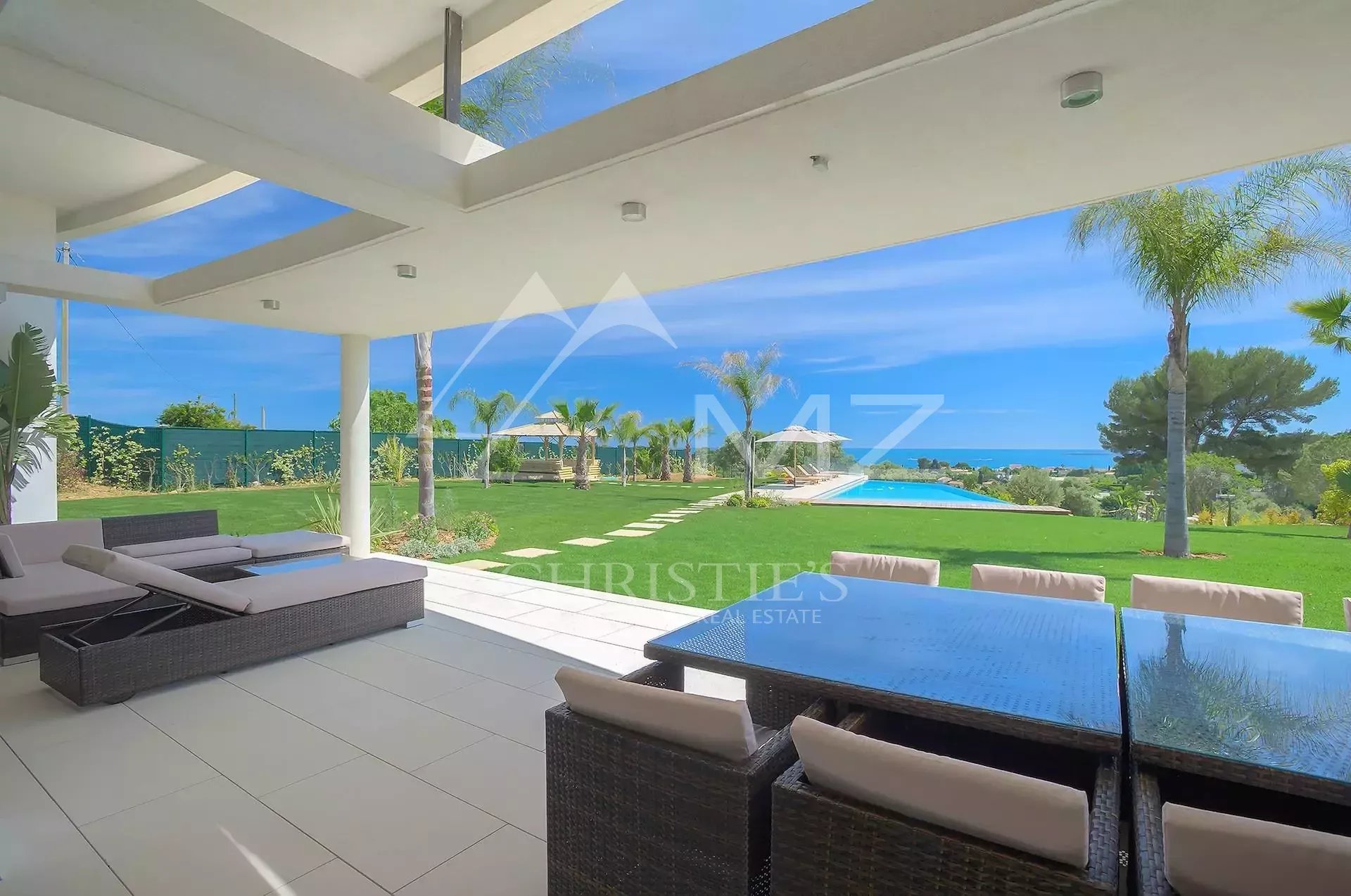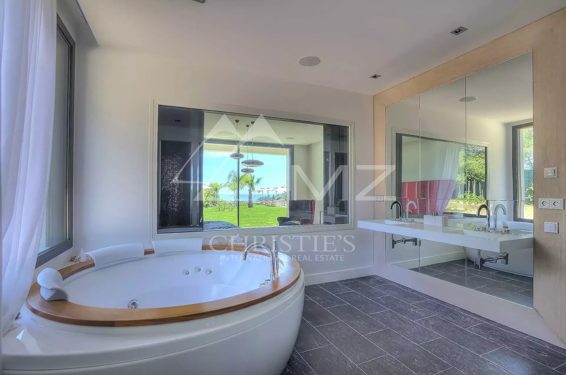 Stunning new Californian-style villa of approximately 500 sq m, comprising: a living room with dining area and views of the Cap d'Antibes bay, a fully equipped kitchen, an office, a lounge, a master bedroom with dressing room and whirlpool bathroom, two bedrooms with shower rooms, a bedroom with bathroom, two children's bedrooms and a shower room. On the mezzanine level, a games room, a 14-seat cinema, a pantry, a wine cellar and a laundry room. A studio apartment with kitchen, living room, bedroom and shower room. Heated infinity pool. 3-car garage. 8000 sq m plot.