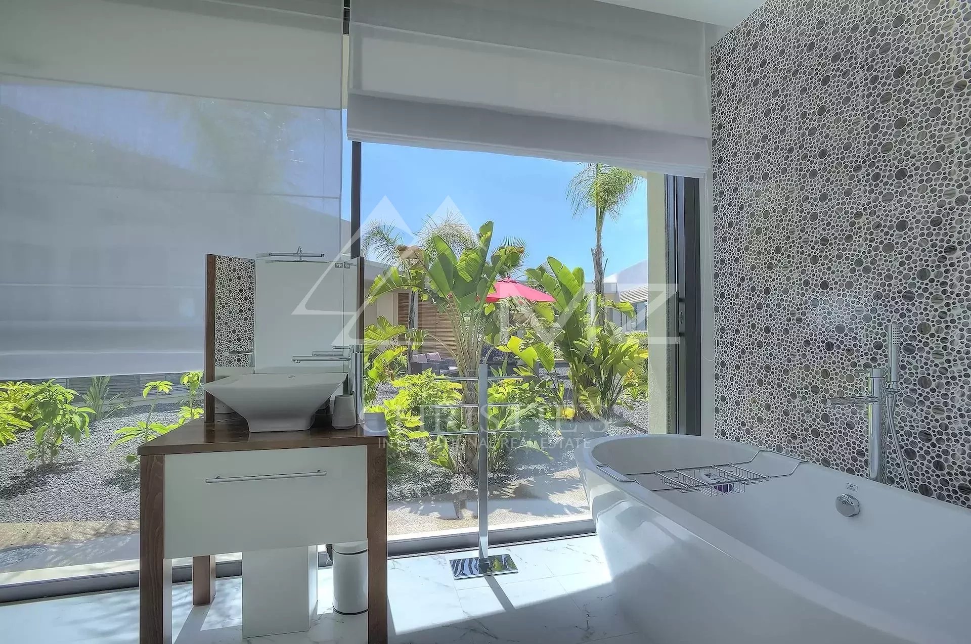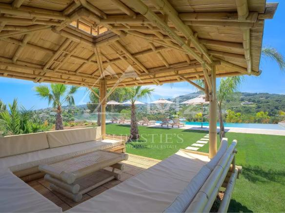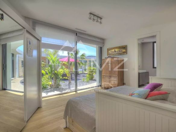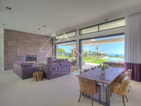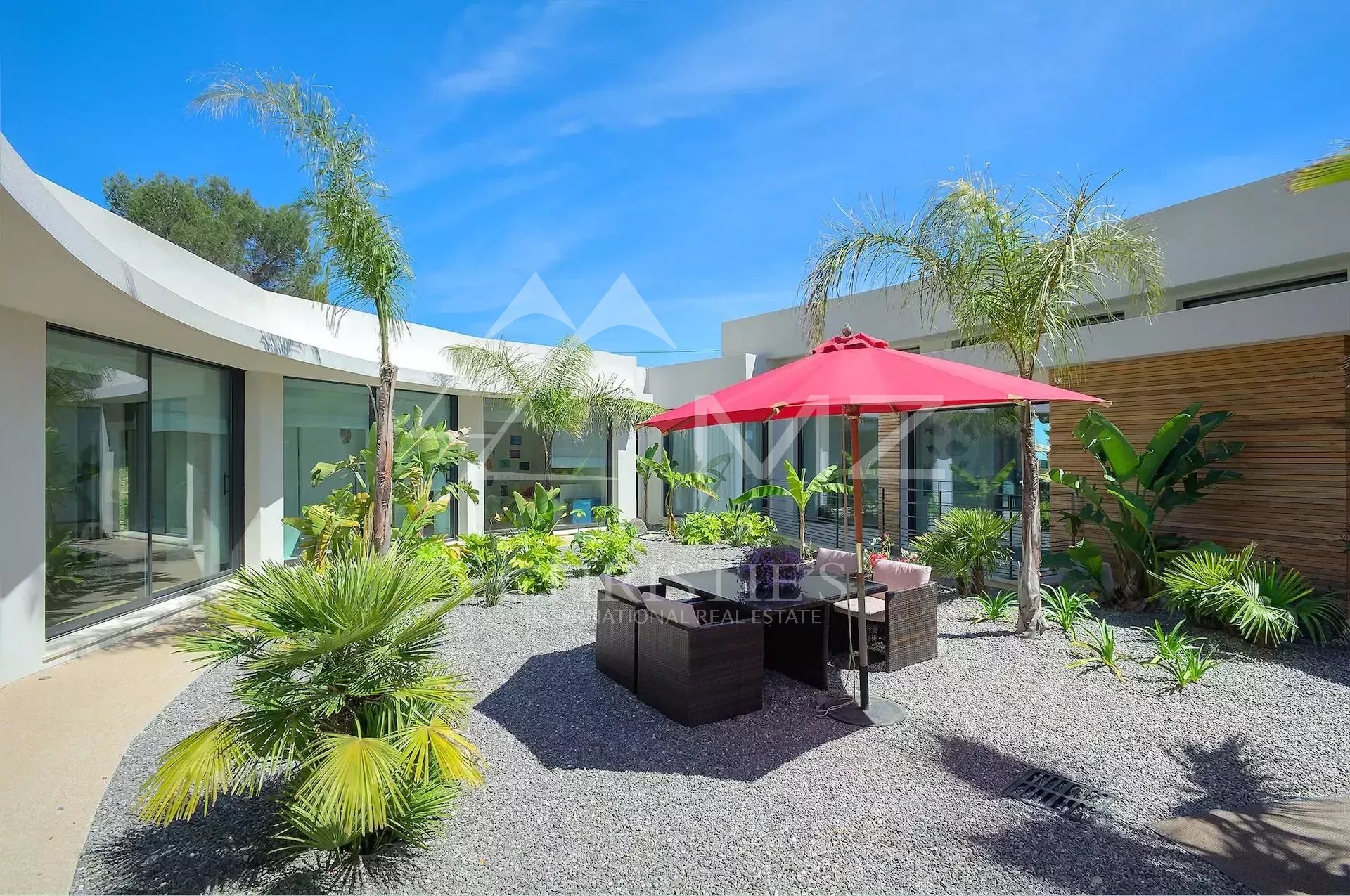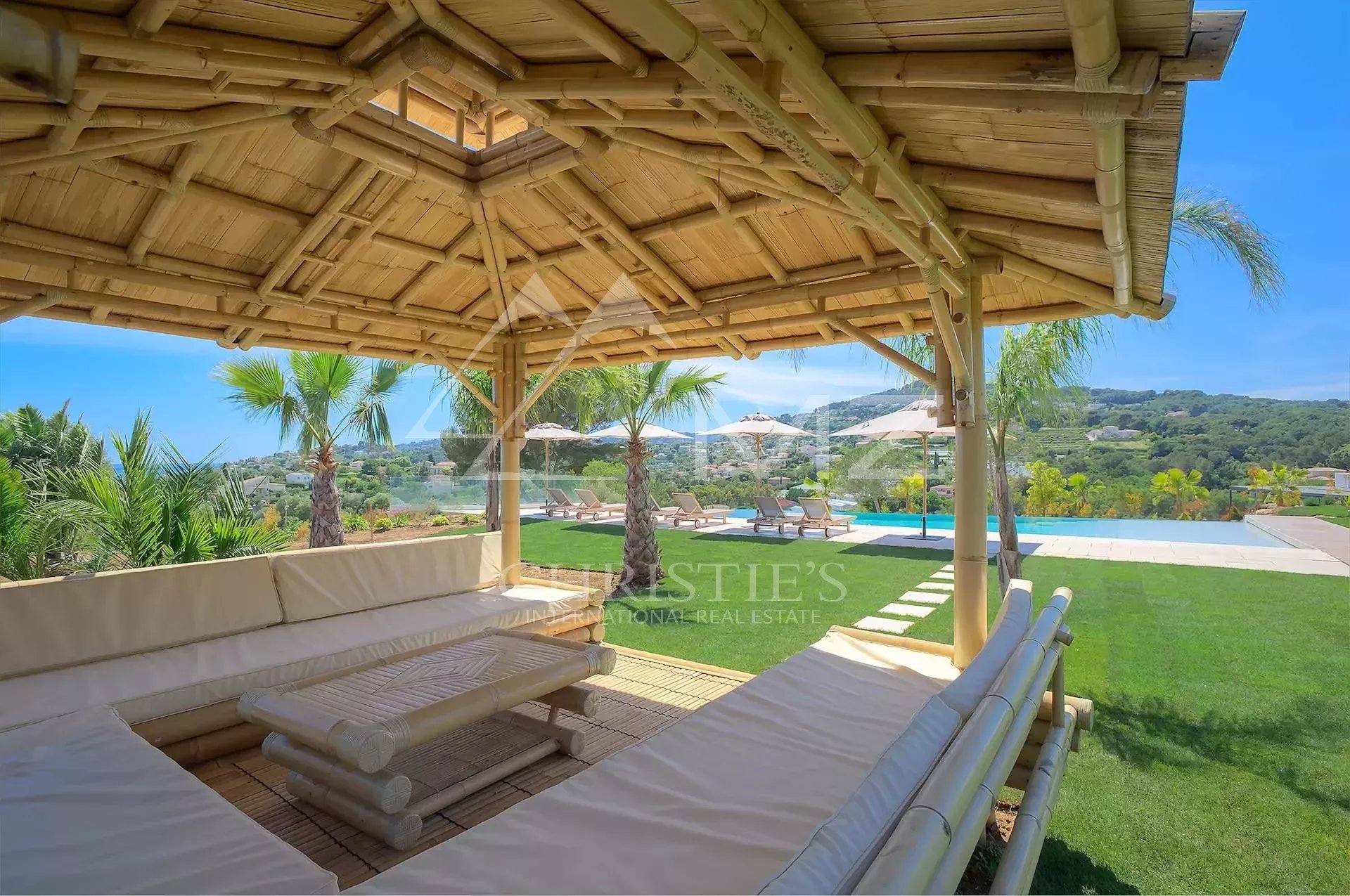 Stunning new Californian-style villa of approximately 500 sq m, comprising: a living room with dining area and views of the Cap d'Antibes bay, a fully equipped kitchen, an office, a lounge, a master bedroom with dressing room and whirlpool bathroom, two bedrooms with shower rooms, a bedroom with bathroom, two children's bedrooms and a shower room. On the mezzanine level, a games room, a 14-seat cinema, a pantry, a wine cellar and a laundry room. A studio apartment with kitchen, living room, bedroom and shower room. Heated infinity pool. 3-car garage. 8000 sq m plot.