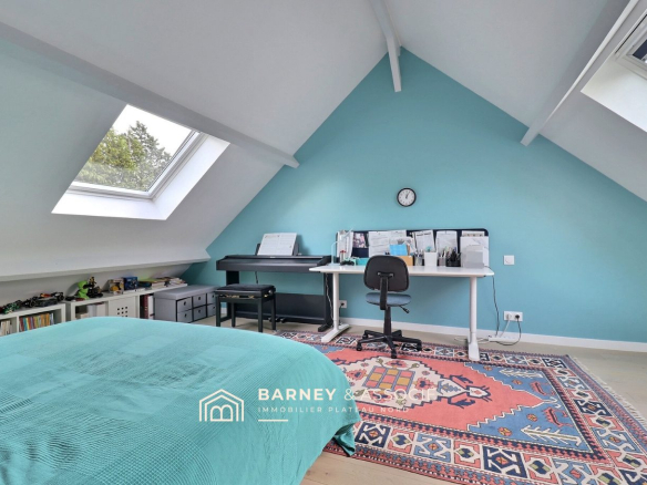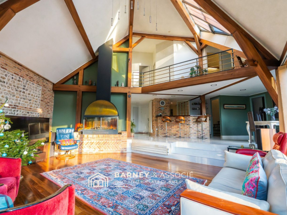 In excellent condition, this house boasts a charming 50 sq m living room with a cathedral ceiling and fireplace. Open to the dining room and kitchen, it leads naturally to the secluded and perfectly situated garden.