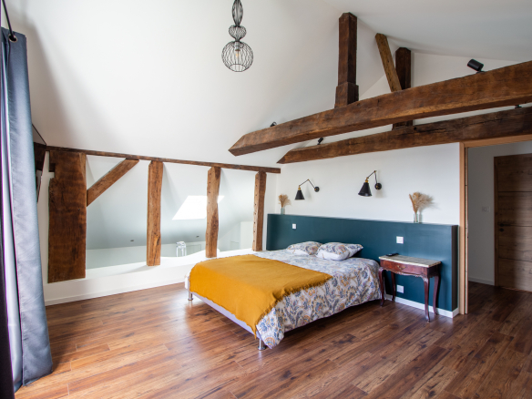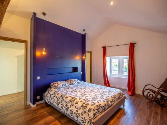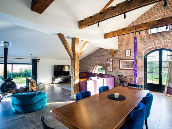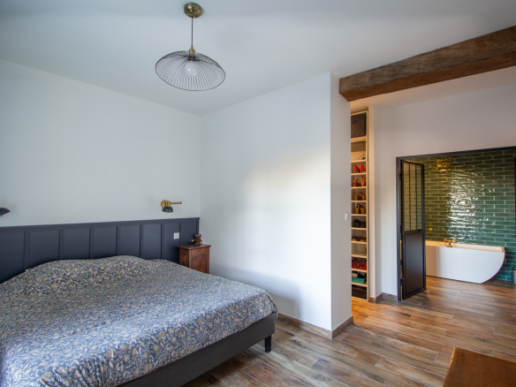 Upon entering, you'll discover a vast living area of approximately 100m² with a lounge, a fully equipped open-plan kitchen, and a dining room under a high ceiling. The wood-burning stove adds a warm ambiance, while a pantry and laundry room make everyday life easier. The ground floor also offers two master suites with dressing rooms, two additional bedrooms, and a shower room.