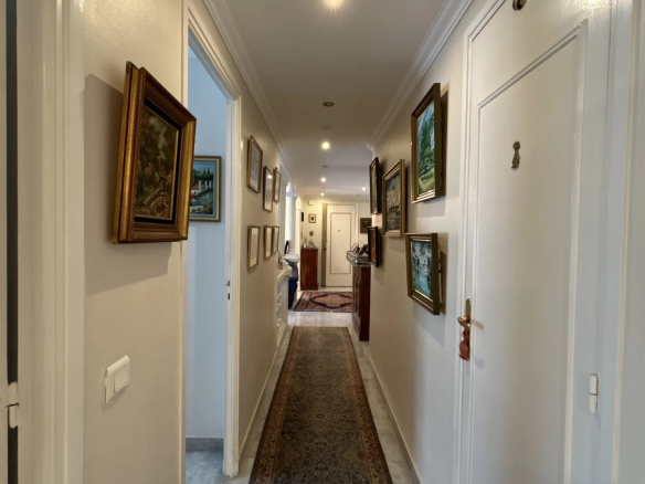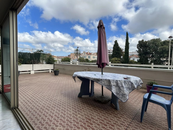 In the heart of Cannes, in a secure residence, this 3-room apartment of nearly 80 m² features a 16 m² enclosed terrace and a 45 m² open terrace. It comprises an entrance hall with built-in wardrobes, a separate kitchen (which could be opened up), a living room, two good-sized bedrooms, a shower room with WC, and a guest WC. All rooms open onto the terrace. A cellar is included, and a closed garage is available at an additional cost.