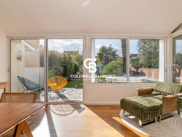 Upon entering, a spacious 54m² living room with French doors leads to the terrace and a charming garden adorned with palm trees and a heated outdoor pool (heat pump).
