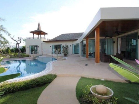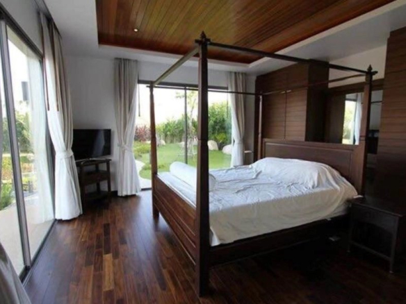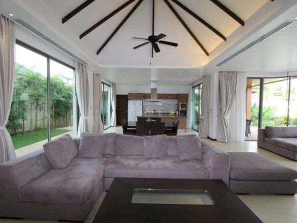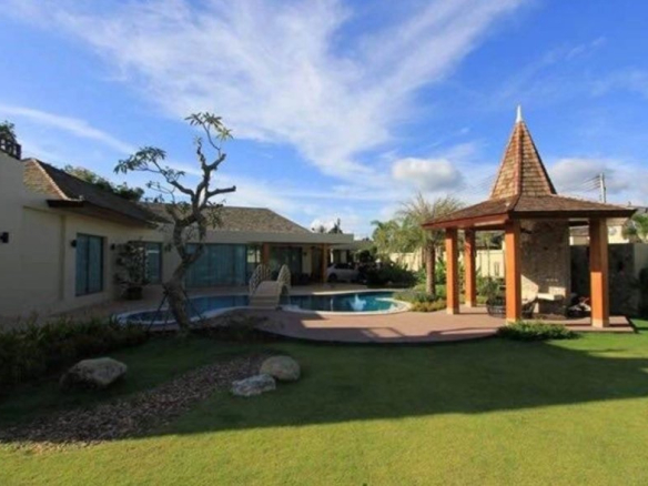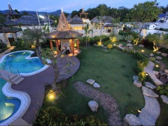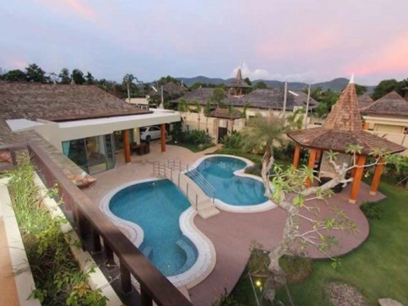 A stunning Balinese-style villa with a swimming pool, combining modern design elements with traditional Thai architectural features. From the moment you step through the massive antique Asian gates of the compound, this villa impresses you: from the tropical gardens and covered terraces outside to the beautiful hardwood dining table, numerous four-poster beds, and comfortable, elegant furnishings inside.