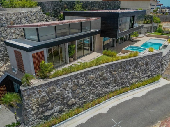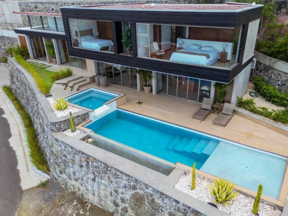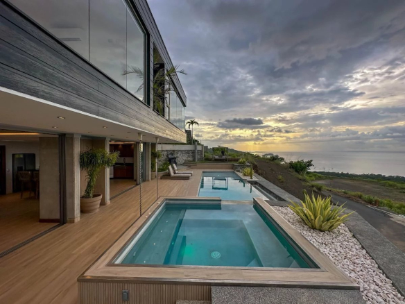 Upon entering, you'll be immediately captivated by the breathtaking views of Playa Hermosa and Santa Rosa National Park. Beside you, the picturesque Papagayo Bay unfolds, home to prestigious establishments such as the Four Seasons, the Ritz-Carlton, La Marina, and the Waldorf Astoria. On a clear day, majestic volcanoes can be glimpsed on the horizon. Crafted from premium European materials, this exceptional home is a true masterpiece of design and aesthetics, combining elements like steel, cedar, natural stone, and glass to create an atmosphere of tranquility and luxury.