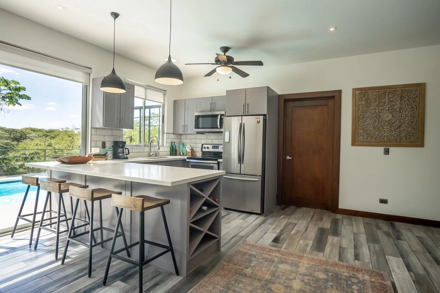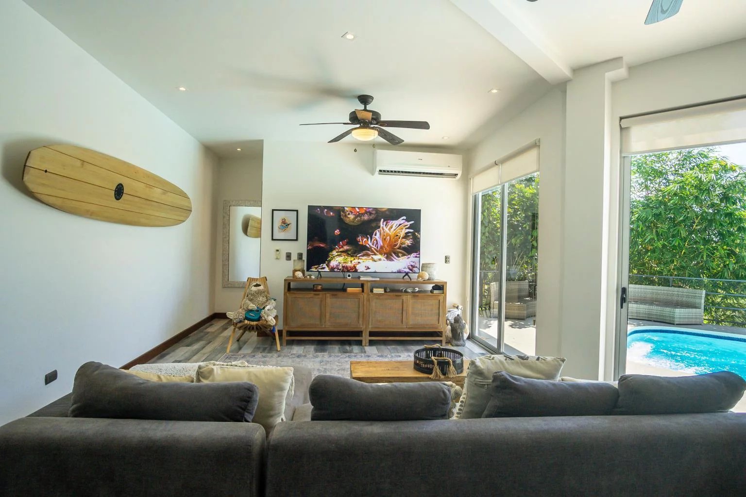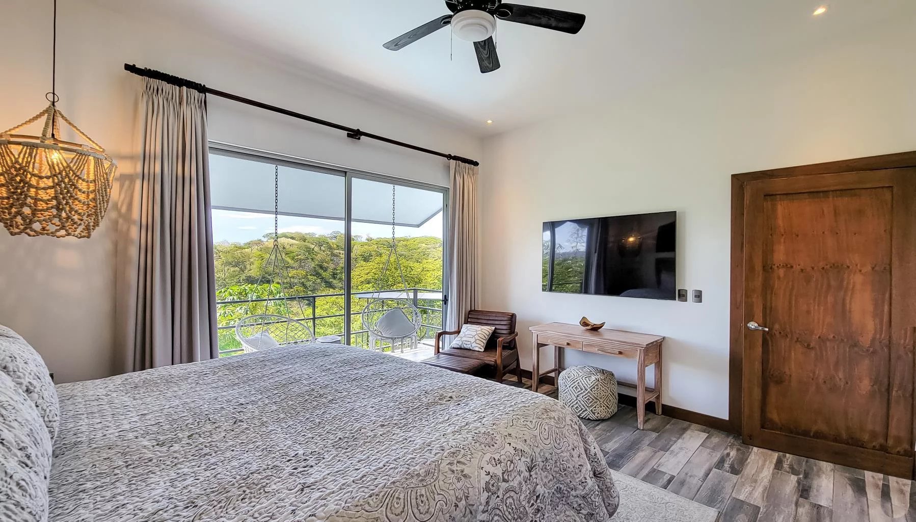 Take the modern teak staircase with a large picture window to the second level, where you'll find two more master suites, private terraces, and a bonus vaulted-ceiling TV room or office.