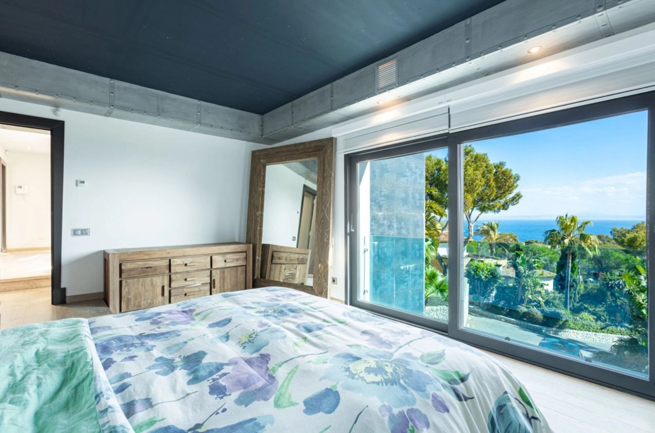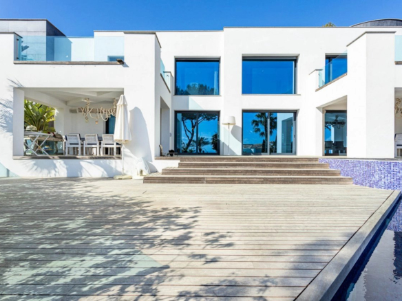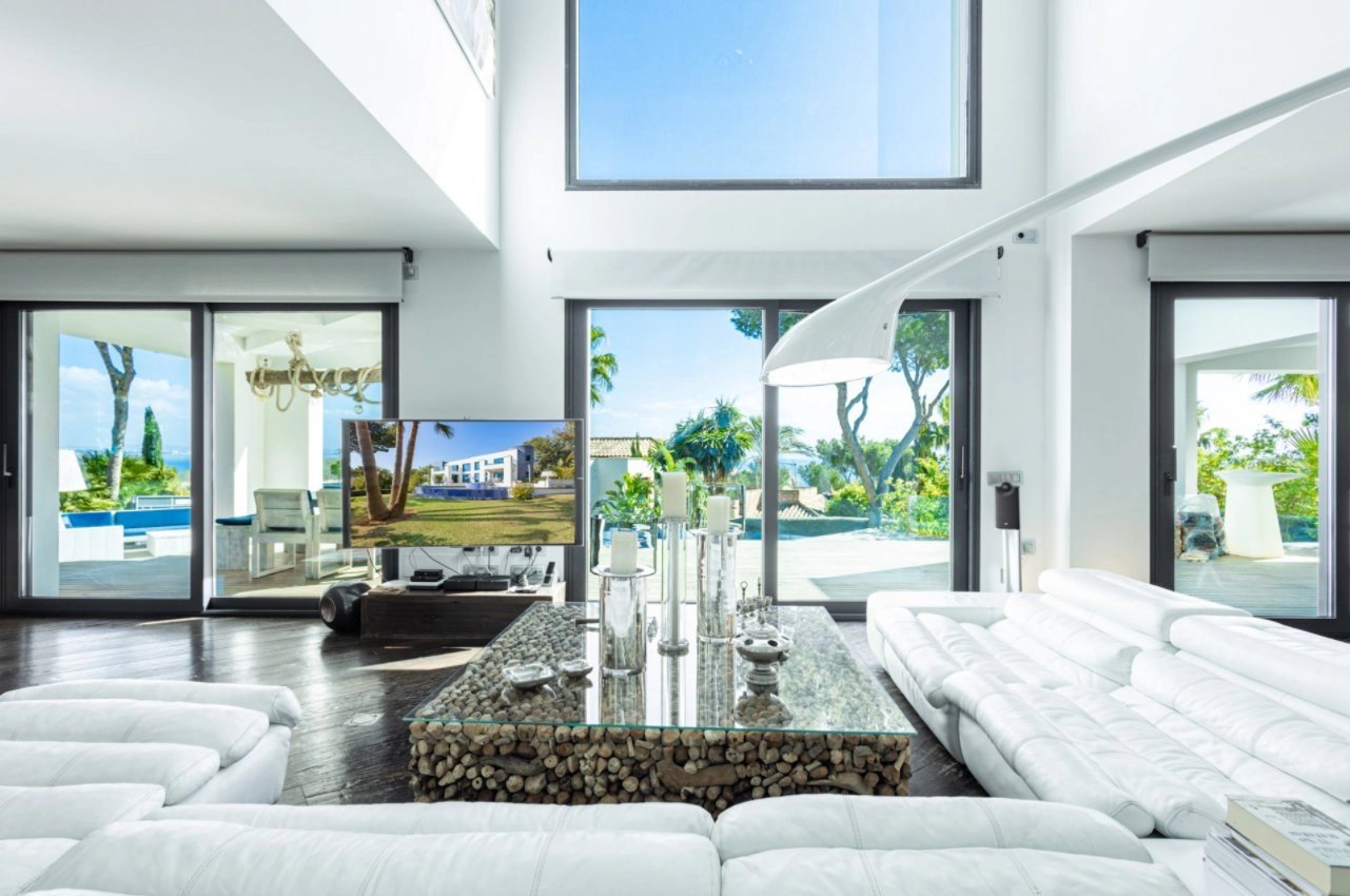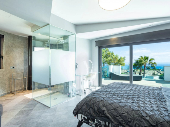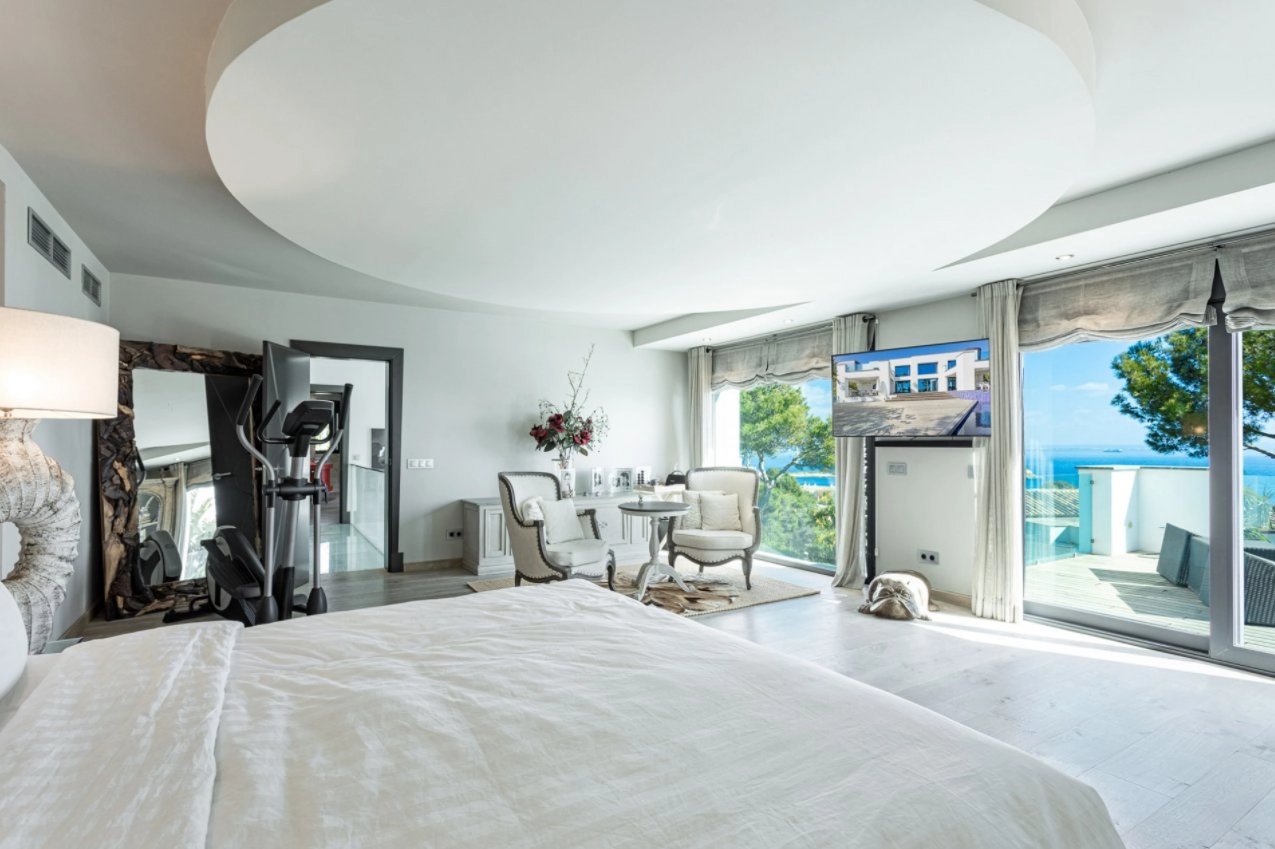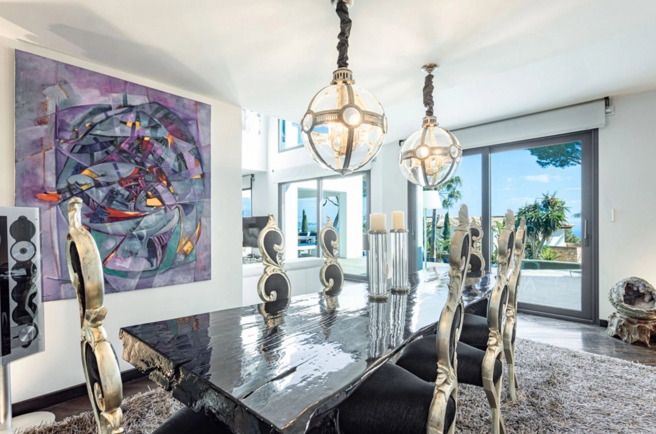 A modern villa with a minimalist style and clean lines, combined with a spectacular and colorful contemporary interior design. It is situated on a large plot and offers 6 bedrooms and 6 bathrooms. The spacious living-dining room with a fireplace and large bay windows opens onto a large terrace with sea views, which provides access to the garden and swimming pool. In addition, there is a rooftop solarium with panoramic sea views.