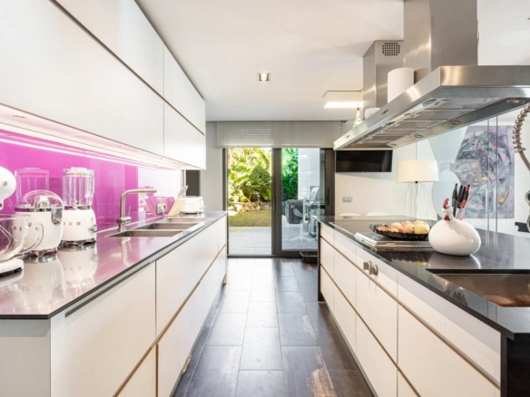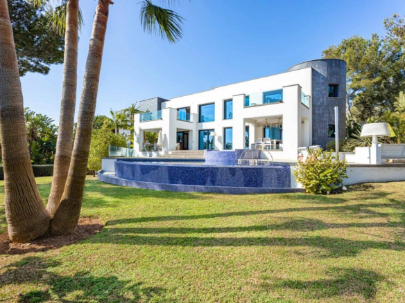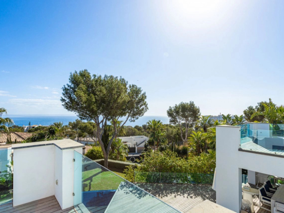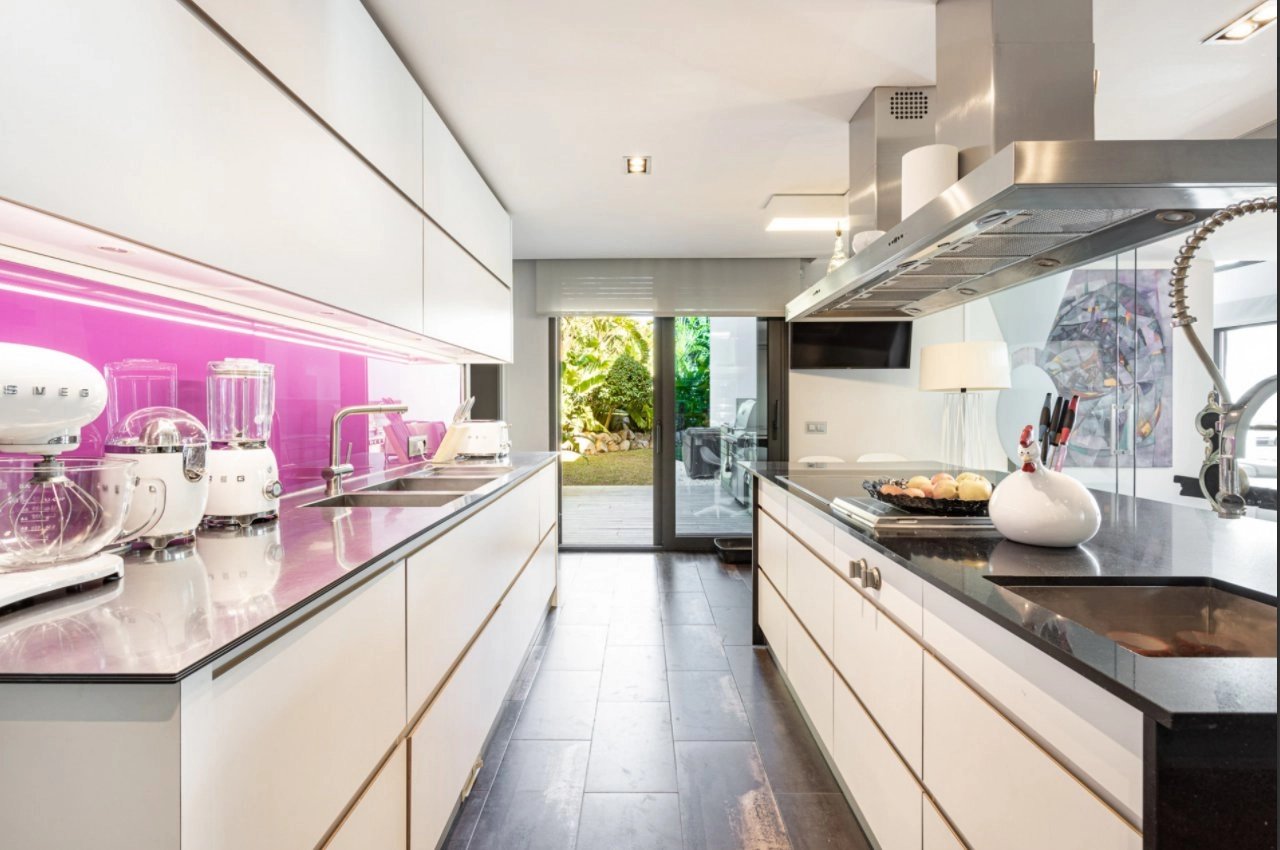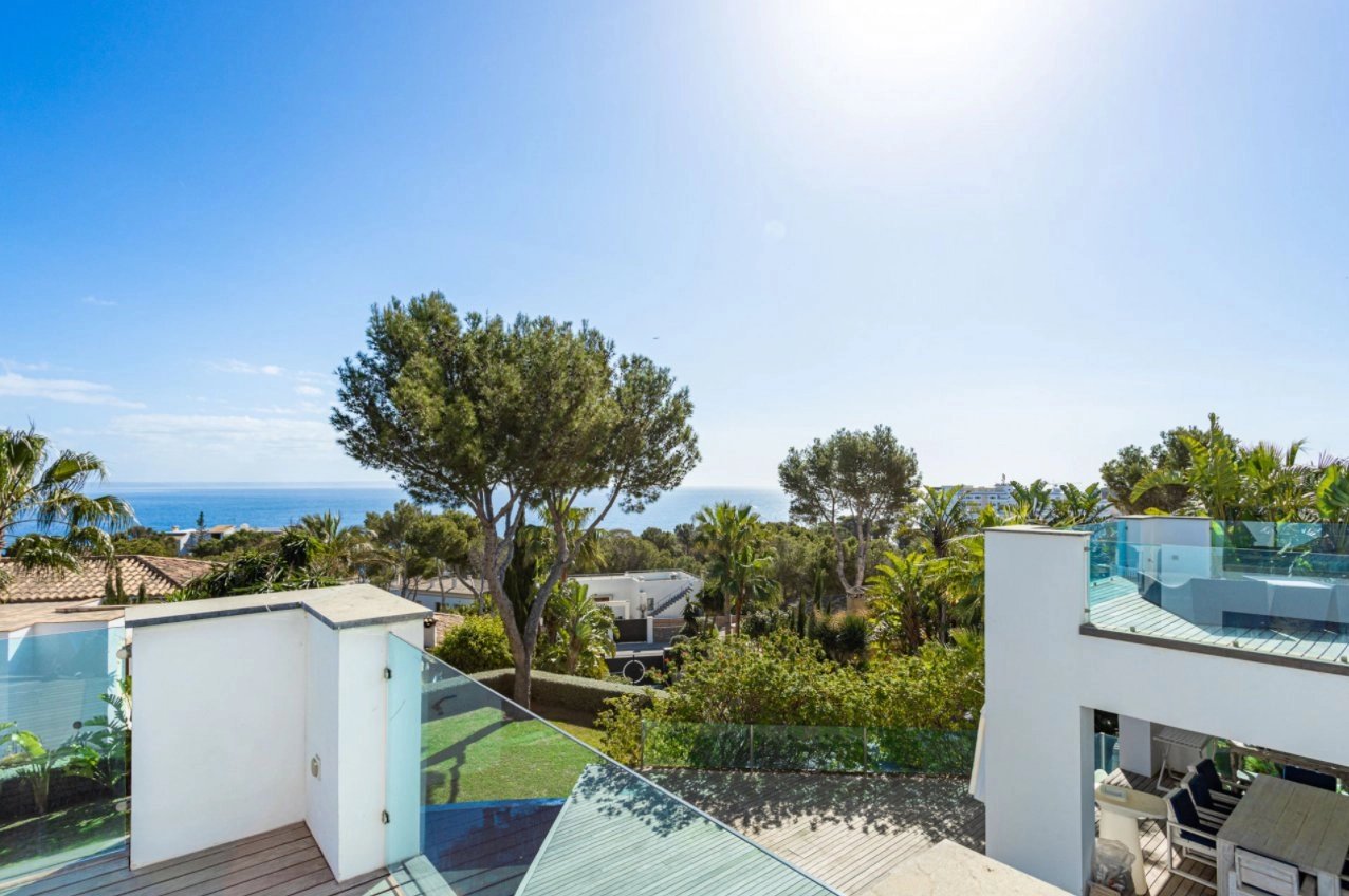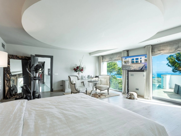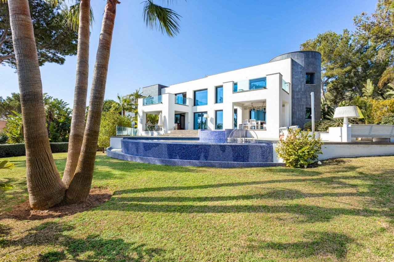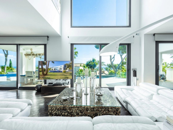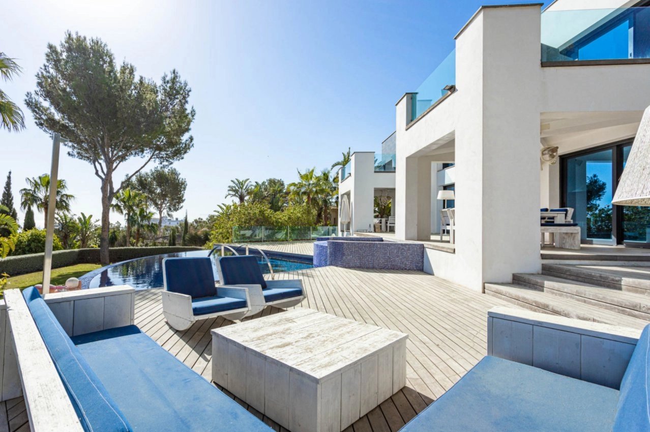 A modern villa with a minimalist style and clean lines, combined with a spectacular and colorful contemporary interior design. It is situated on a large plot and offers 6 bedrooms and 6 bathrooms. The spacious living-dining room with a fireplace and large bay windows opens onto a large terrace with sea views, which provides access to the garden and swimming pool. In addition, there is a rooftop solarium with panoramic sea views.
