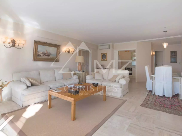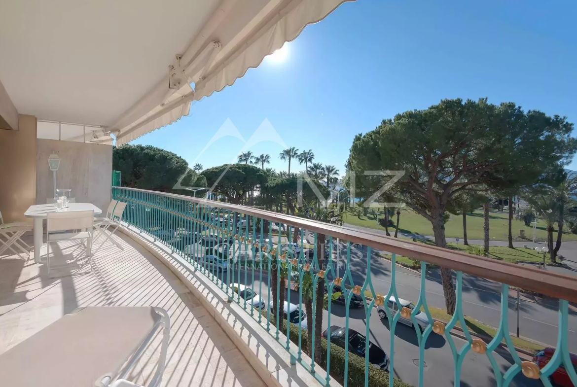 Ideally located, beautiful apartment on the Croisette of approximately 90 m², comprising: a living room with access to a terrace and sea view, a fitted kitchen, a bedroom suite with dressing room and bathroom, two bedrooms and a shower room.