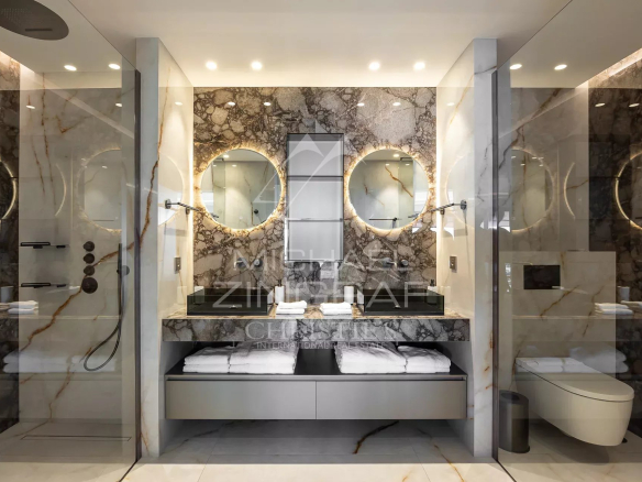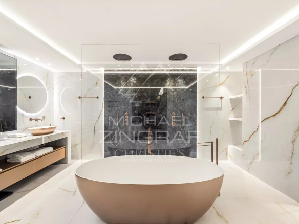 The sleeping area is a true gem, with five en suite bedrooms, all decorated and furnished with meticulous attention to detail. Two of these bedrooms face south, offering direct sea views.