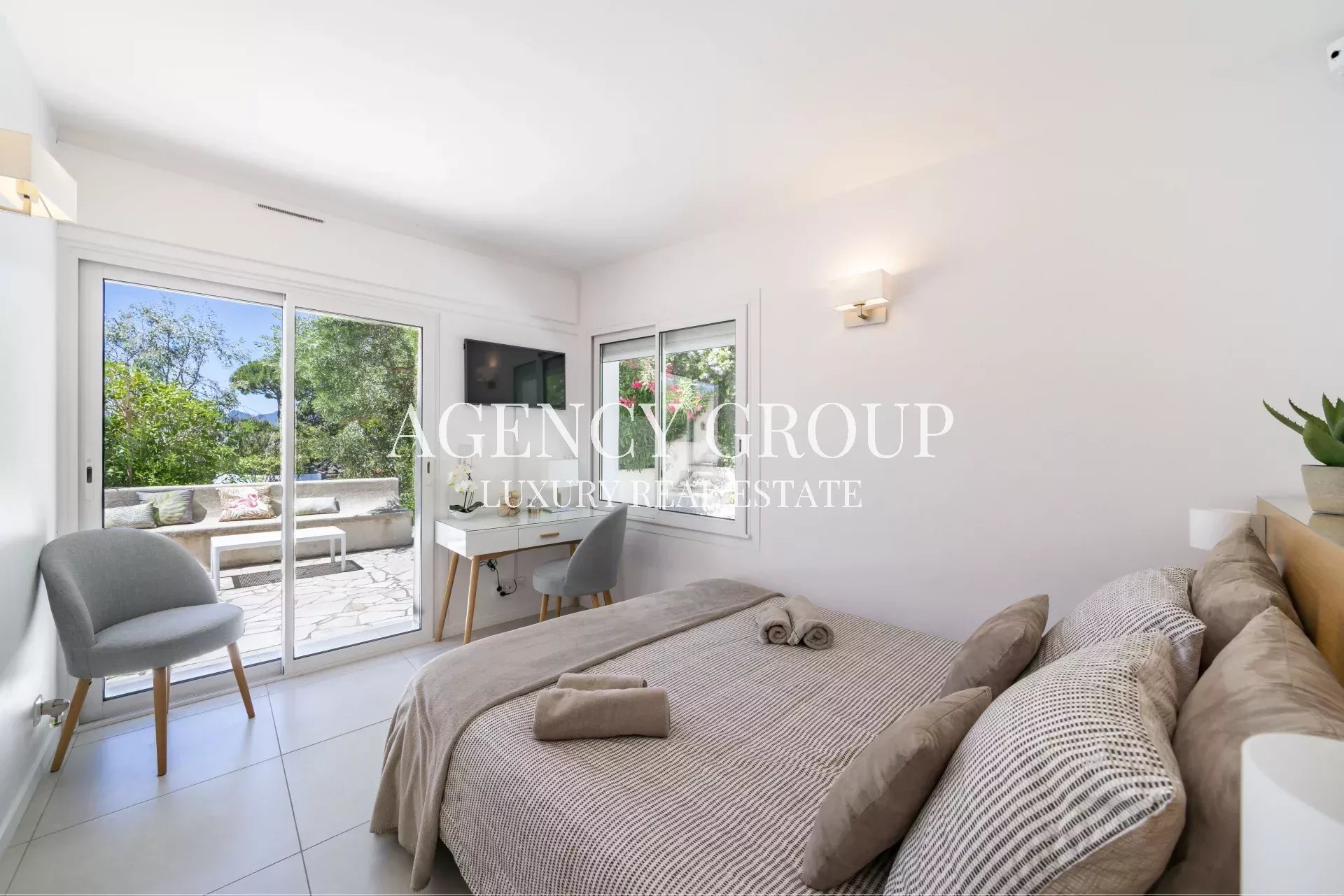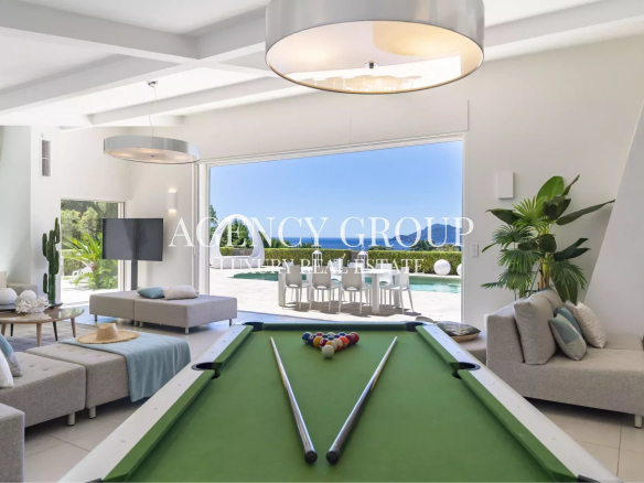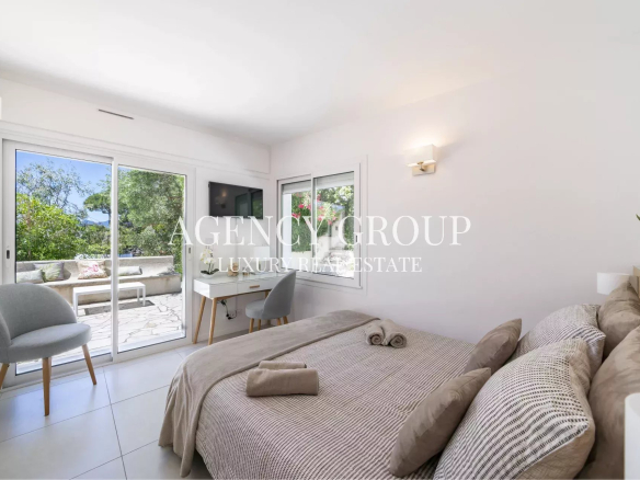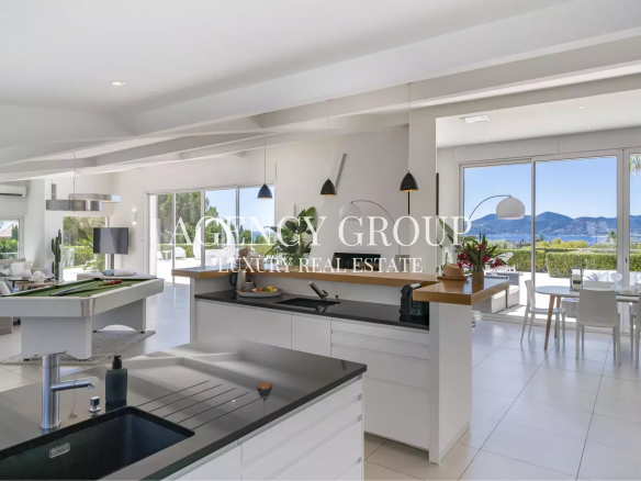 Upstairs, the villa comprises a living room opening onto the heated pool and panoramic sea views thanks to the full opening of its bay windows, an American kitchen, a dining room and a sumptuous master bedroom with its panoramic terrace.