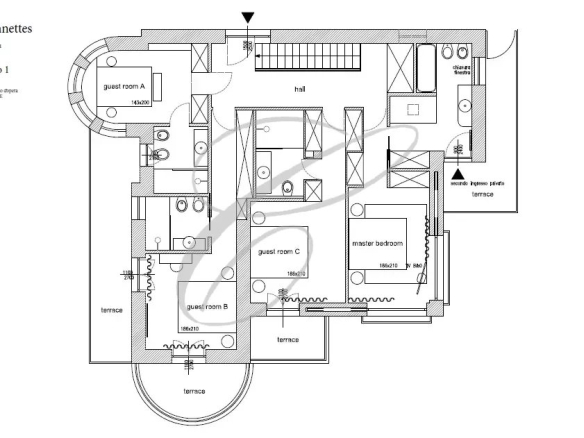 First floor: three bedrooms with en-suite bathrooms and dressing rooms. Access to the roof terrace.