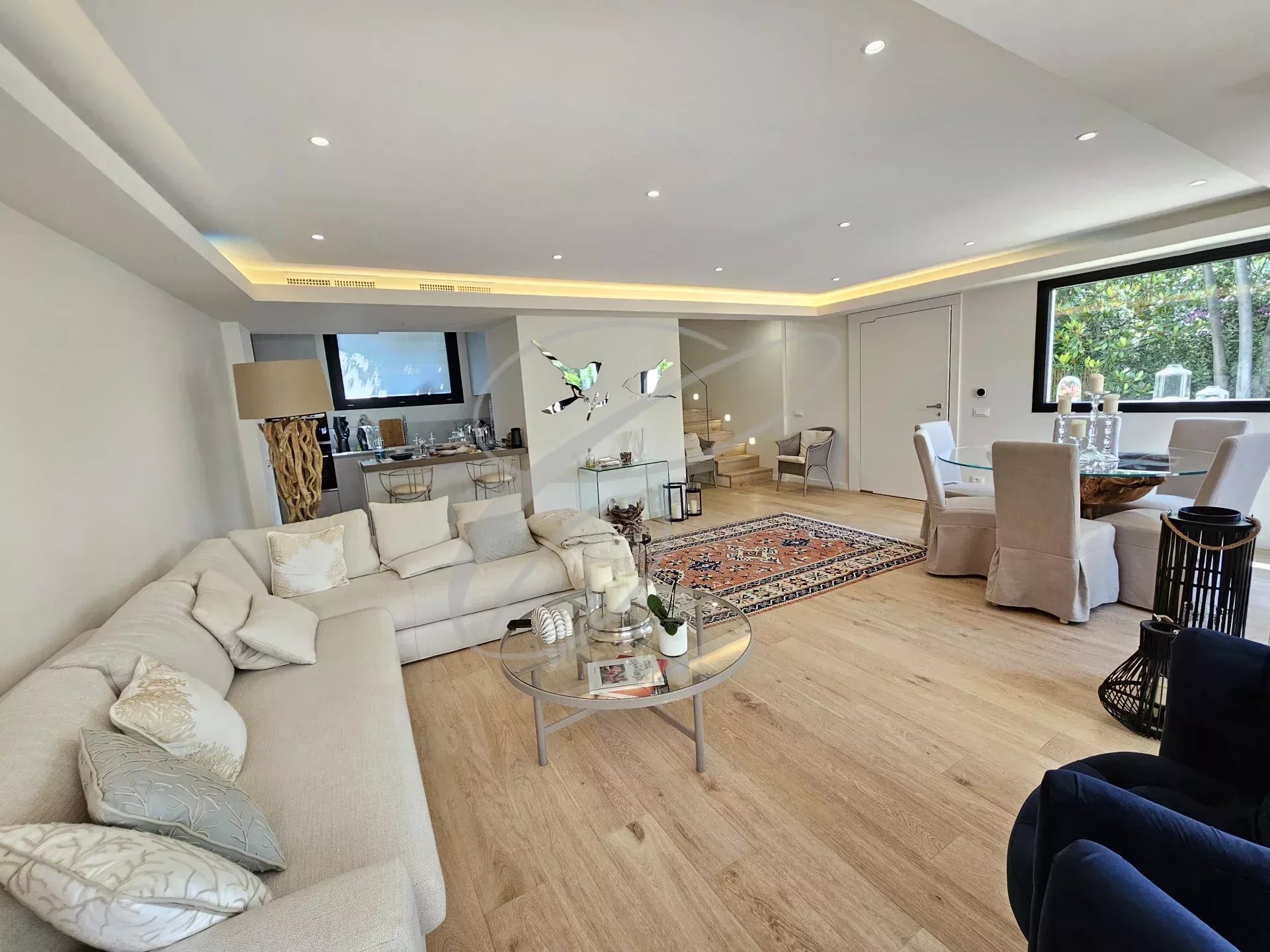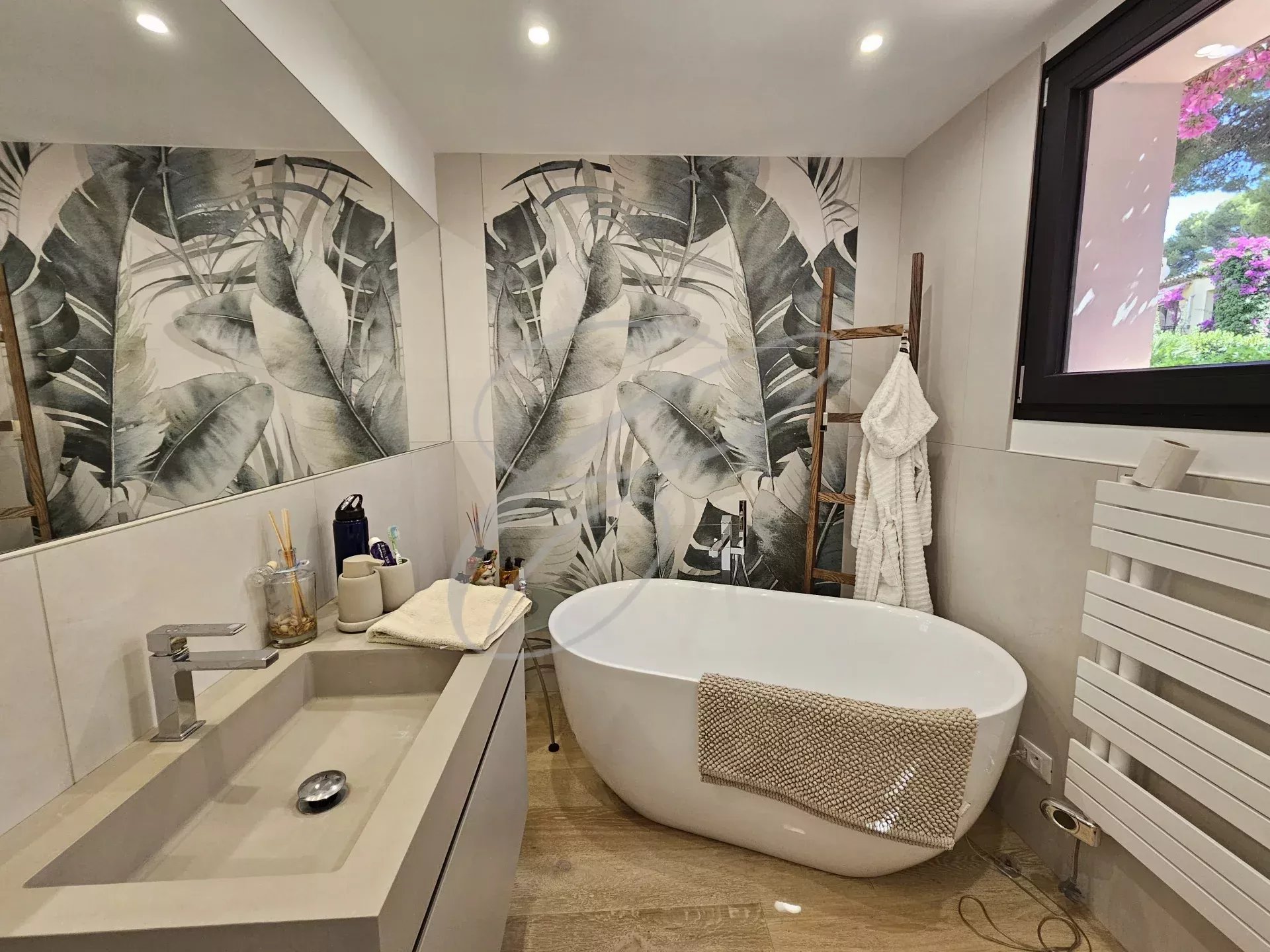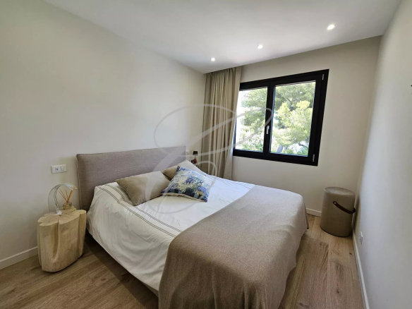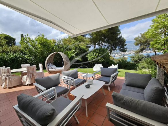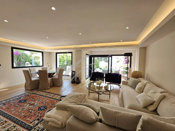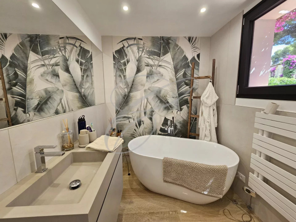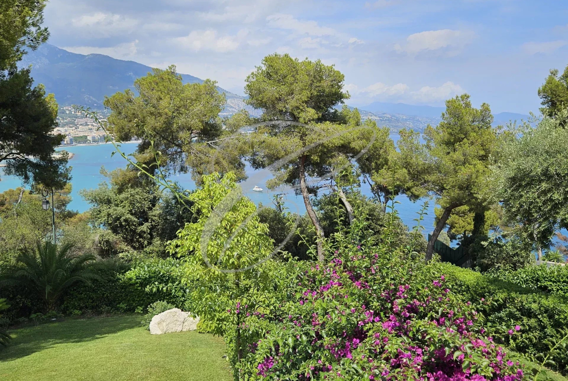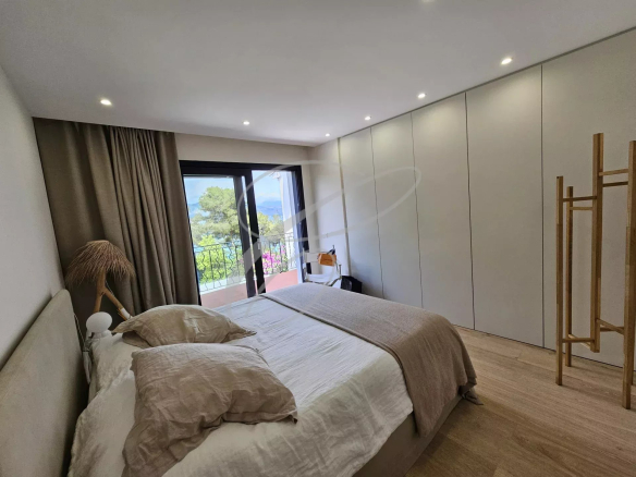 Near Monaco, in a secure residence with concierge, swimming pool, and sauna, a superb renovated villa nestled in a garden with sea views. It
