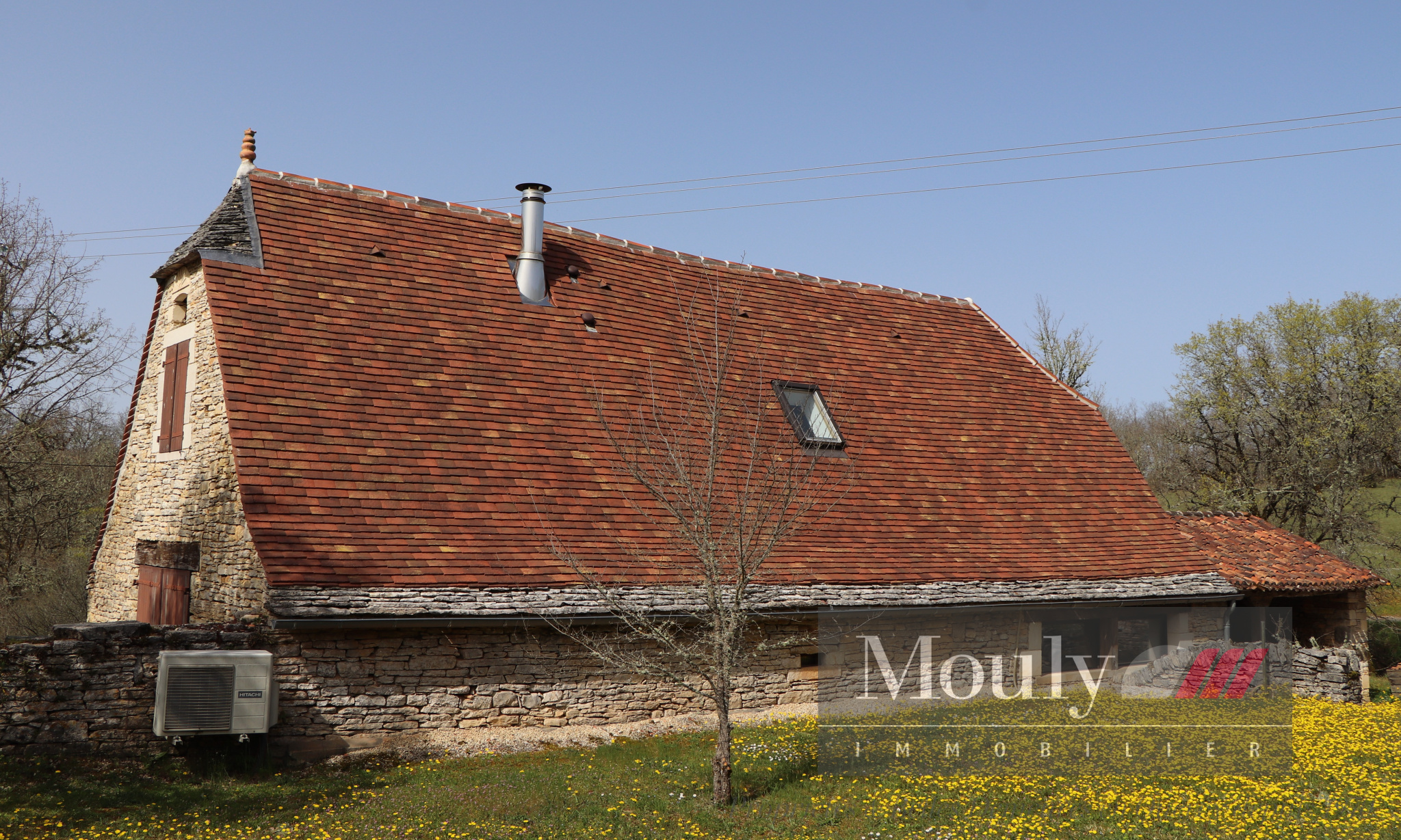 The main house, approximately 120 m², comprises an open-plan kitchen/living/dining room with a fireplace, three bedrooms, and two bathrooms. It has electric underfloor heating and is equipped with reversible air conditioning.