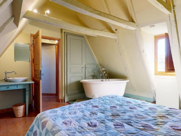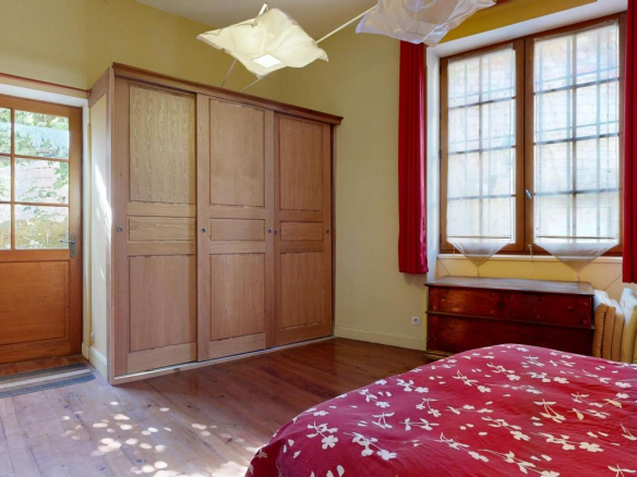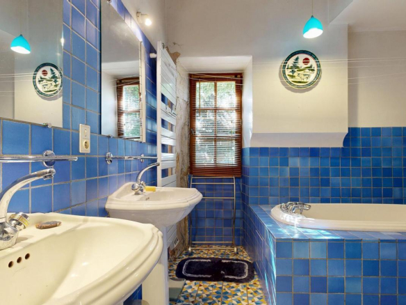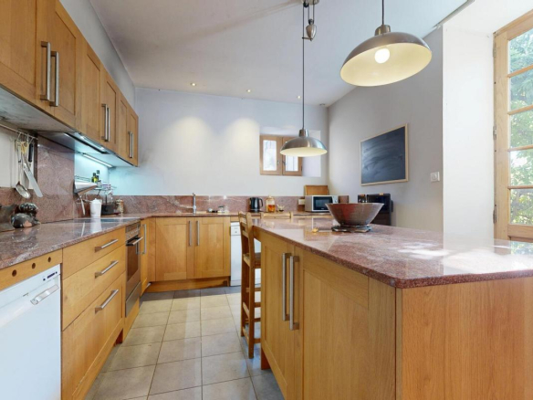 With 215 sq m of living space, it features 4 bedrooms, 3 bathrooms, 1 shower room, a beautiful open-plan living area with a fully equipped kitchen, and a sitting room with a fireplace. A large downstairs room (with a traditional fireplace) and attractive black and white checkered flooring could serve as a workshop or summer lounge.