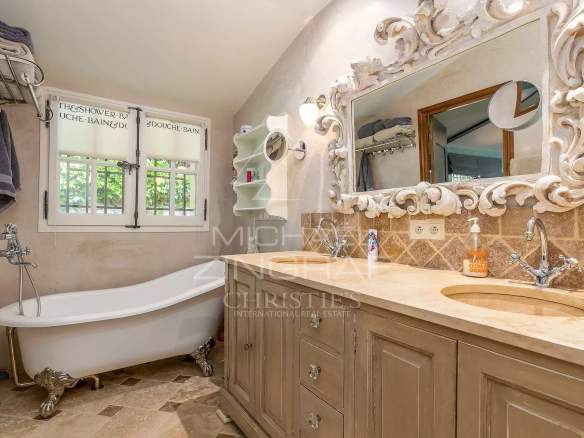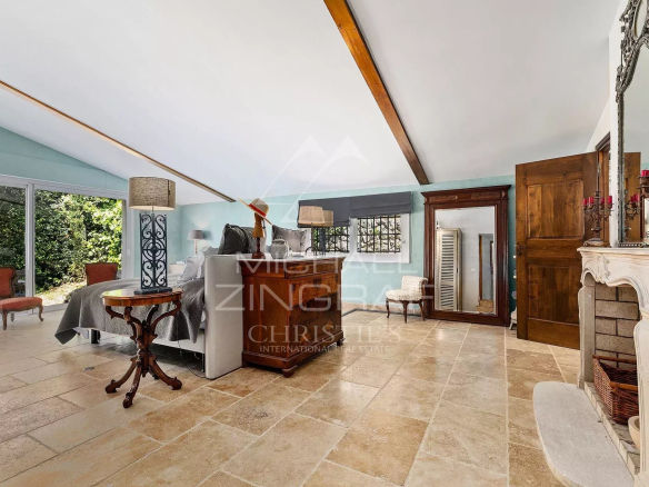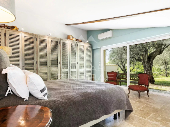 Magnificent renovation using authentic materials for this delightful villa, situated in a commanding position and enjoying optimal sunshine thanks to its southwest exposure. Set on approximately 3215m² of land planted with Mediterranean trees and featuring a swimming pool, the two-story villa offers, on the ground floor, an eat-in kitchen and a spacious living room with a mezzanine, both opening onto the garden; upstairs, four beautiful bedrooms, each with a bath or shower. An independent studio is located in the garden.