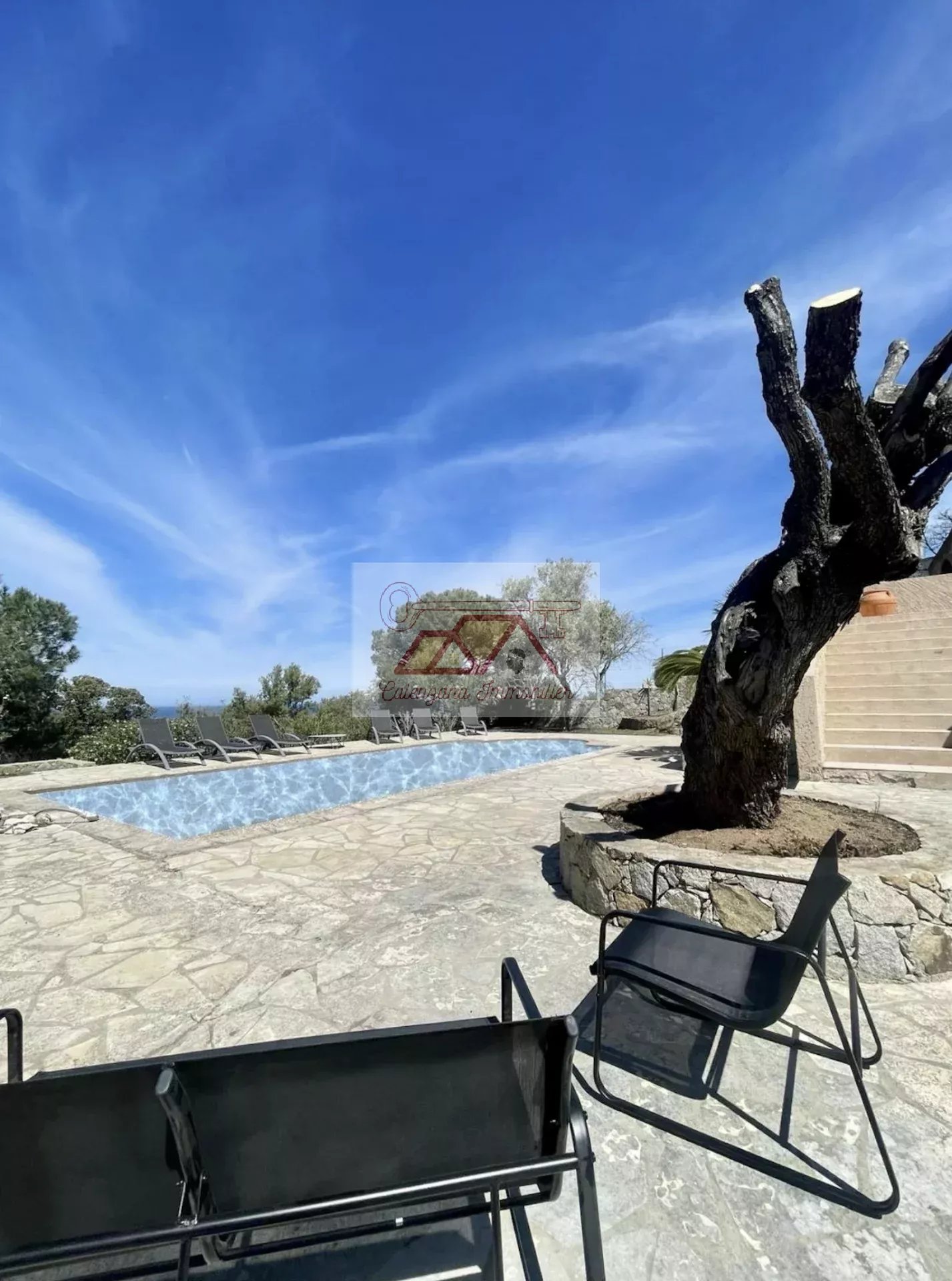 The villa is surrounded by landscaped green space with a large swimming pool overlooking the sea, which needs restoration, adding an extra touch to this charming property.