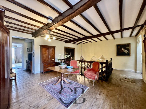 On the second floor: A large bedroom, much appreciated by children for its spaciousness of over 30 m², has been renovated to preserve the exposed beams and allow natural light to enter through the dormer windows, adding considerable charm.