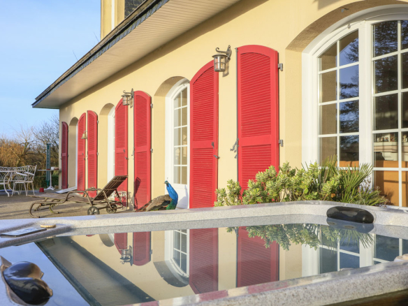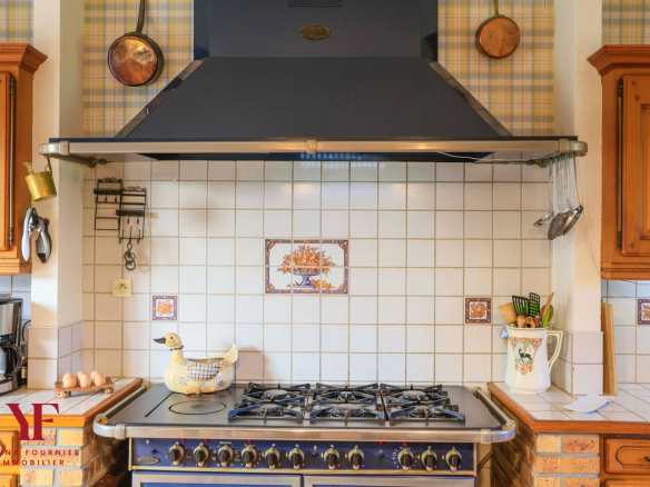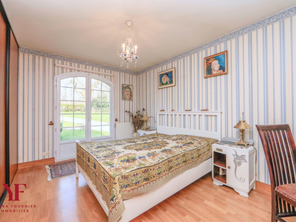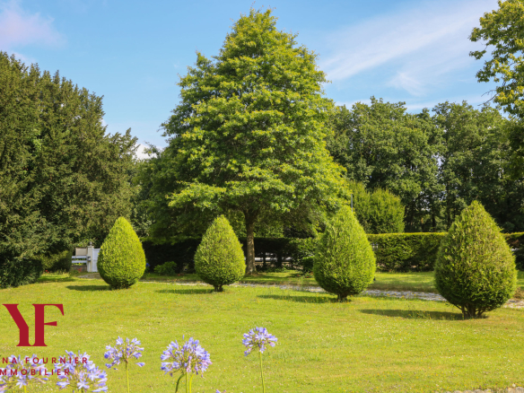 Outside, the terrace with a jacuzzi overlooks an exceptional landscaped park, a true haven of peace. The grounds, bordered by a stream and featuring a pond, offer several living spaces: a vegetable garden, an orchard, a chicken coop, a wooded area, a small sheepfold, and a Japanese-inspired garden, ideal for nature lovers seeking tranquility.