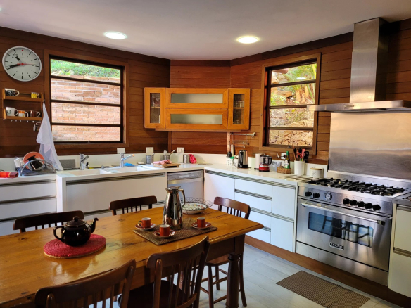 The main house boasts 450 square meters of built space, constructed entirely of high-quality wood. The first floor features a living room with various seating areas, seamlessly integrated with a terrace that includes a deck, barbecue, and swimming pool offering the best views in Rio de Janeiro. The property also includes a spacious kitchen with access to another terrace and a sauna.