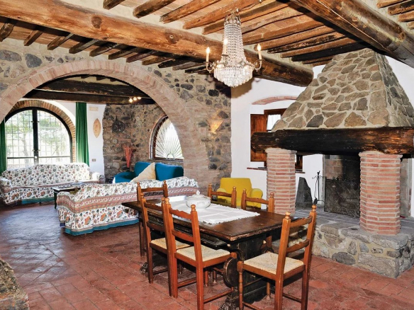 The property is located in a dominant position on two levels including: kitchen, dining room with fireplace, living room, large living room with fireplace and bathroom on the ground floor. On the first floor, which is accessed by an exterior and interior staircase, there is a large living room with billiard table, five bedrooms and two bathrooms. The property has an outbuilding of approx. 100 m². The land surrounding the house is approximately one hectare completely fenced with approximately 150 olive trees, a well, and a beautiful swimming pool.