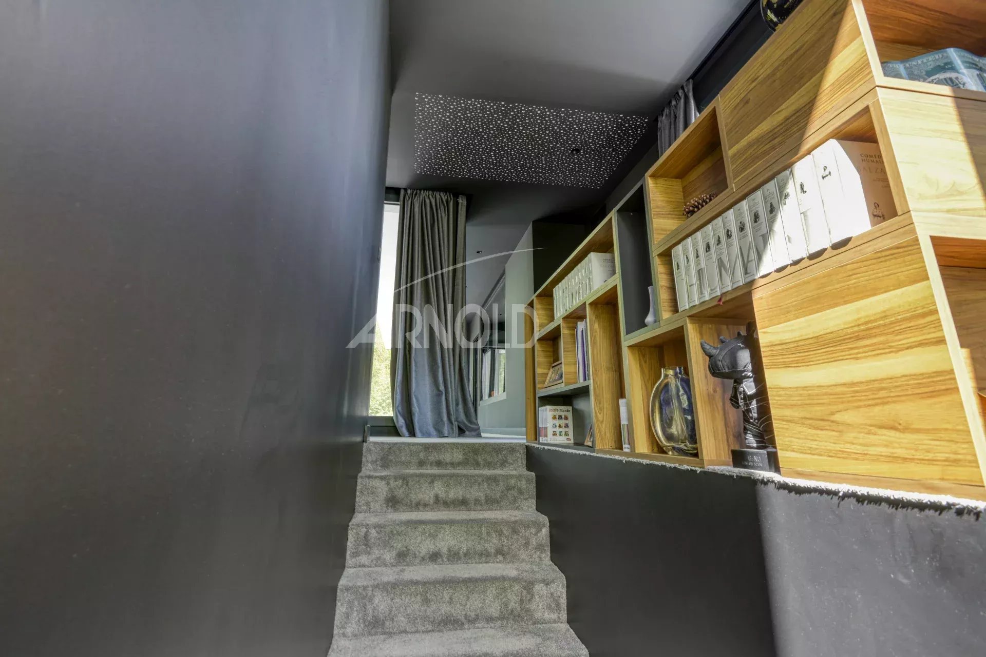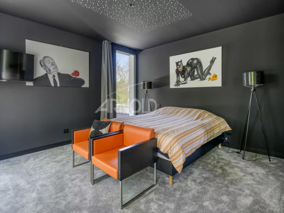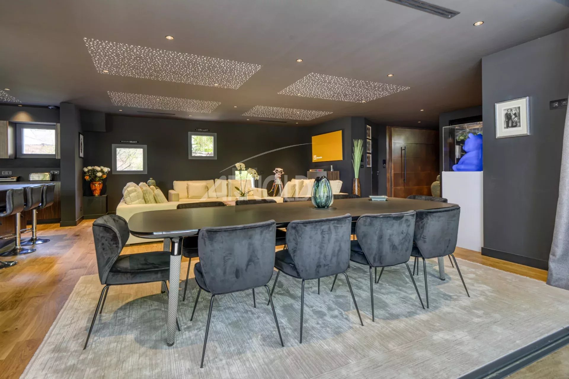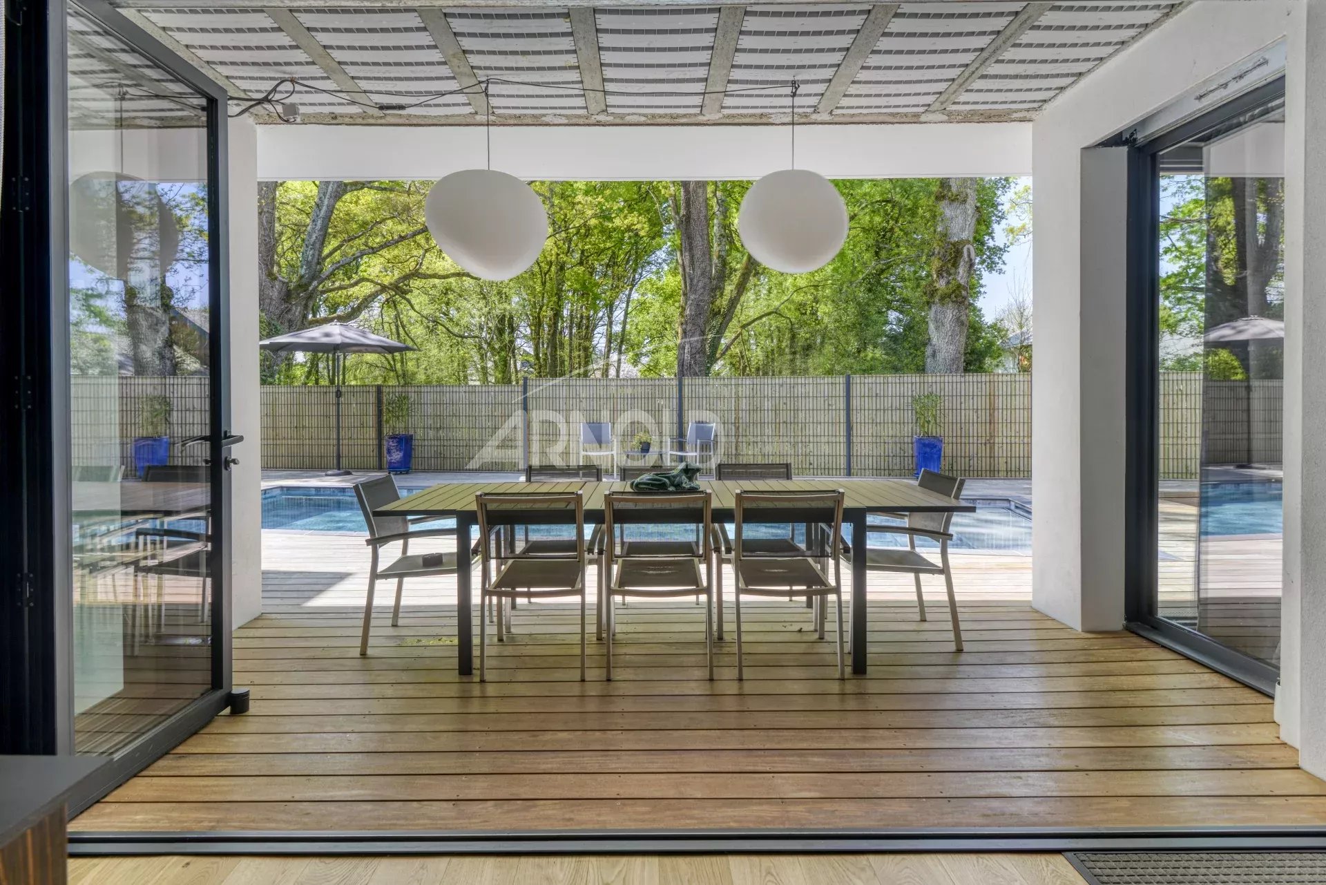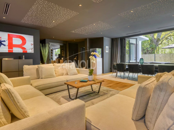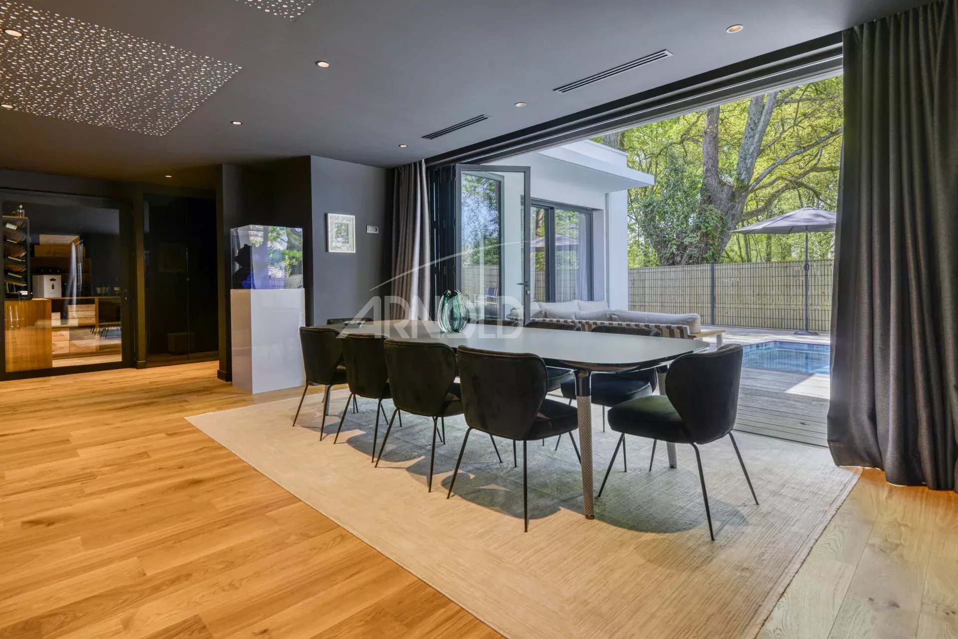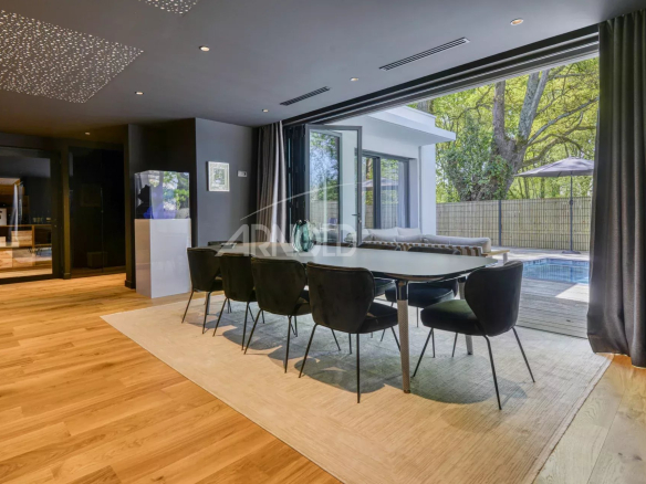 The house offers generous living spaces, including a 75 sq m reception room opening onto the pool and the surrounding nature, featuring an open-plan kitchen with a central island and high-quality appliances. Adjoining this is a relaxation room with a cinema and billiards table. On
