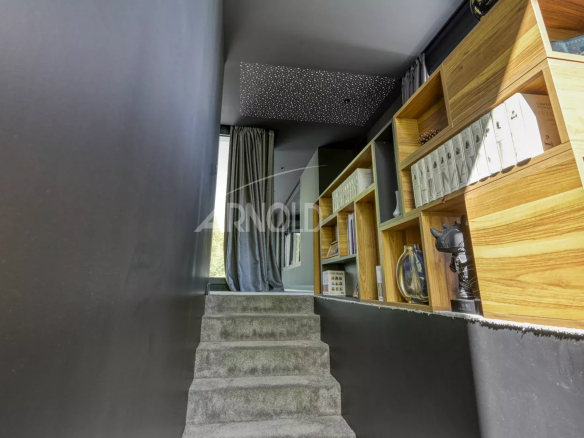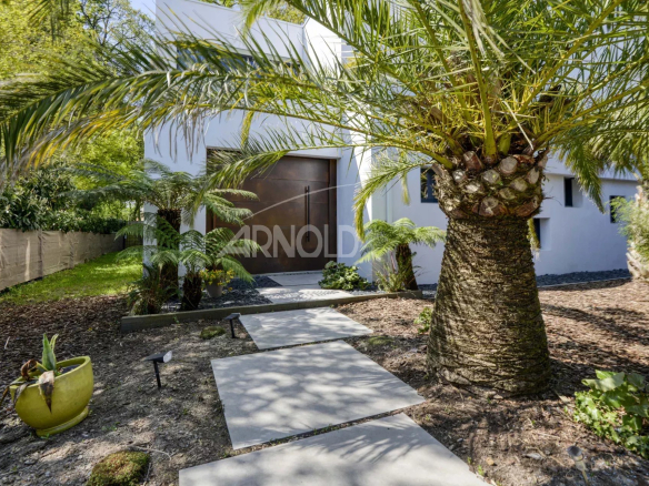 Exceptional and secluded, a beautiful paved driveway adorned with palm trees and exotic ferns leads to a magnificent and prestigious contemporary home reminiscent of a Californian villa.