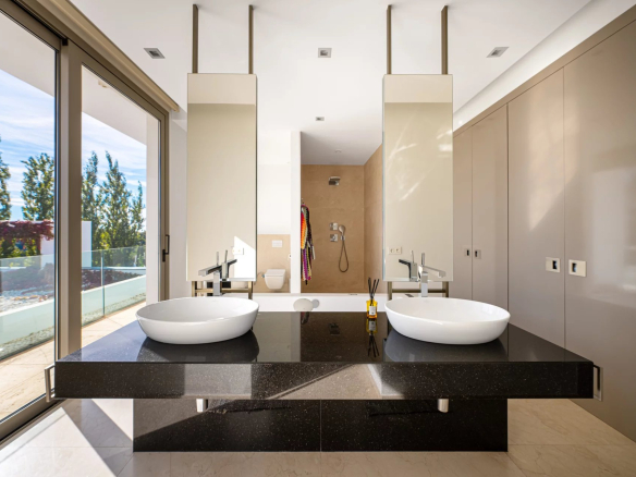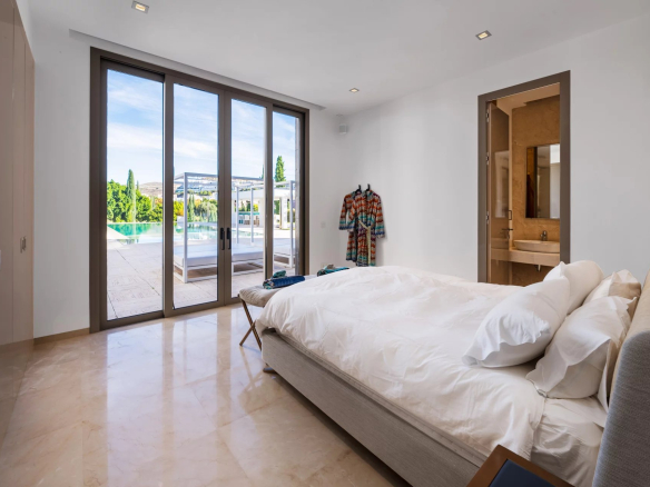 The property includes six serene bedrooms, each with its own en-suite bathroom, and eight modern bathrooms with a minimalist design.