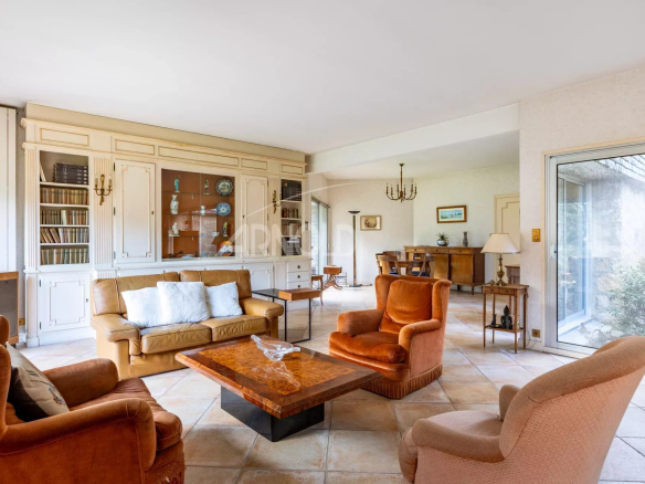 A welcoming entrance hall leads to an office (or bedroom), a spacious living room with a fireplace and large windows that provide ample light and an unobstructed view of the garden.
