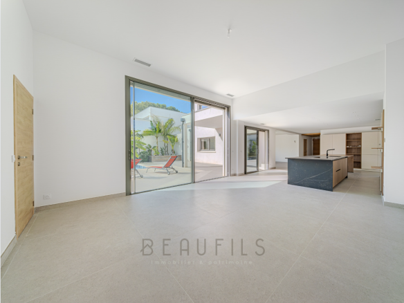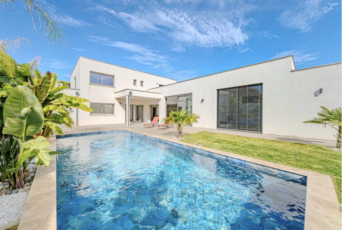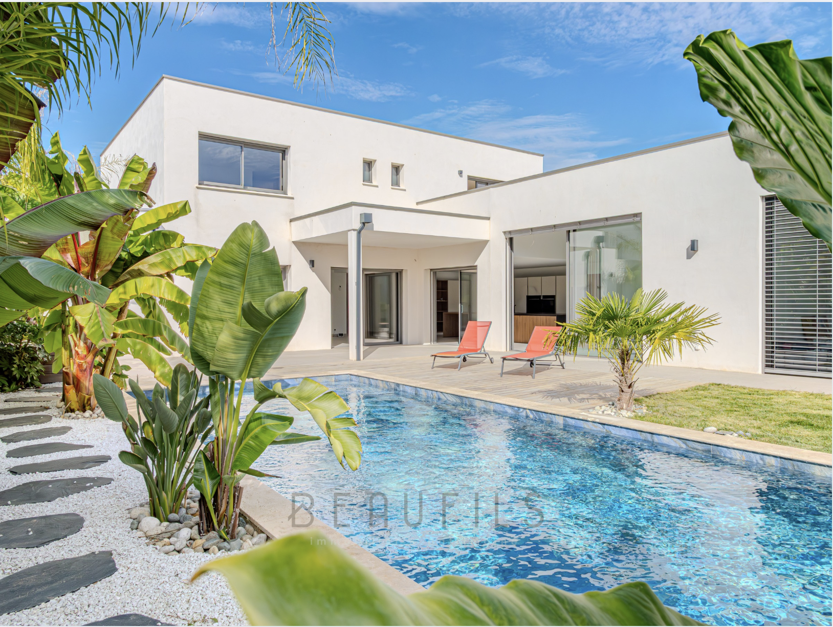 Just 10 minutes from Montpellier and 8 minutes from the beaches, discover this contemporary villa of 330m² (255m² of living space), set on a landscaped plot of 944m², offering complete privacy. This exceptional property boasts a bright and spacious living area with a fully equipped, custom-designed kitchen opening onto a south-facing terrace, a garden, and a 10x5m swimming pool with a surrounding deck. The ground floor comprises a 35m² master suite with a bathroom and a guest bedroom with an en-suite shower room. Upstairs, you'll find a second suite, two bedrooms, a shower room, and a 20m² office/playroom. In addition, there is a tiled and insulated double garage, a pool house, Airzone ducted air conditioning (3 heat pumps), large 120x120 cm tiles, custom-made dressing rooms, automatic watering system, alarm, and handcrafted ironwork (gate, pedestrian gate, railings). Located a 5-minute walk from the tram and the village center. Ten-year structural warranty and builder's risk insurance for complete peace of mind. Contact: Anthony Fages +33 7 71 15 70 03. Agency fees payable by the buyer. RCS 831 872 304. Price excluding fees: €1,900,000. See our fee schedule at: https://www.xbimmoinvest.com/honoraires.pdf