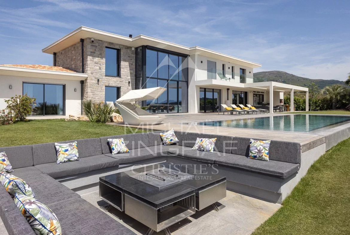In Roquefort-les-Pins, just 25 minutes from Nice International Airport and 10 minutes from the village of Saint-Paul-de-Vence, this contemporary architect-designed villa captivates with its elegant lines, generous proportions, and breathtaking views of the Mediterranean Sea and surrounding hills.