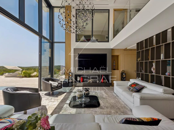 Built with top-quality materials and meticulously designed, the property offers approximately 600 sq m of living space spread over three levels. The expansive reception areas, bathed in natural light thanks to large bay windows, open onto spacious terraces equipped with a bioclimatic pergola and a fully equipped summer kitchen. The 14 x 4.5 m infinity pool invites relaxation and contemplation, while a fire pit creates a convivial atmosphere for summer evenings.