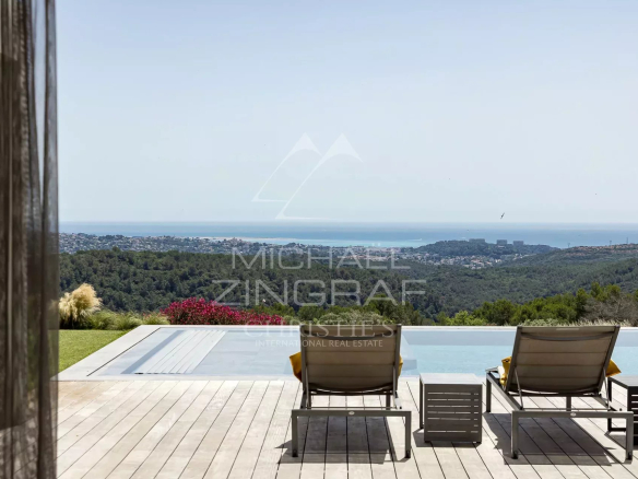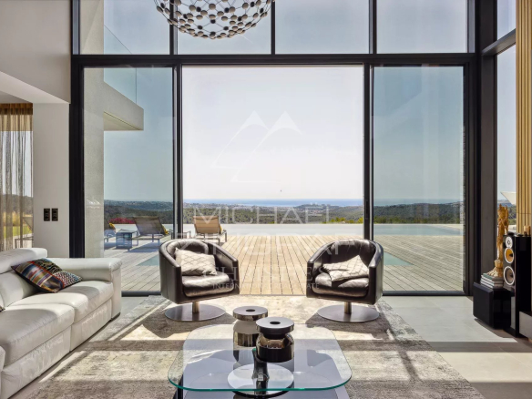 In Roquefort-les-Pins, just 25 minutes from Nice International Airport and 10 minutes from the village of Saint-Paul-de-Vence, this contemporary architect-designed villa captivates with its elegant lines, generous proportions, and breathtaking views of the Mediterranean Sea and surrounding hills.