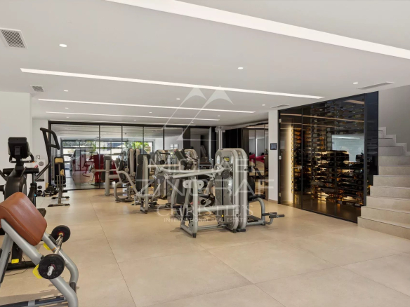 The villa comprises five en-suite bedrooms, each with a private bathroom or shower, as well as a separate apartment, ensuring comfort and privacy for all its occupants. Amenities also include a wine cellar, a gym, and a billiards room with a dedicated lounge.