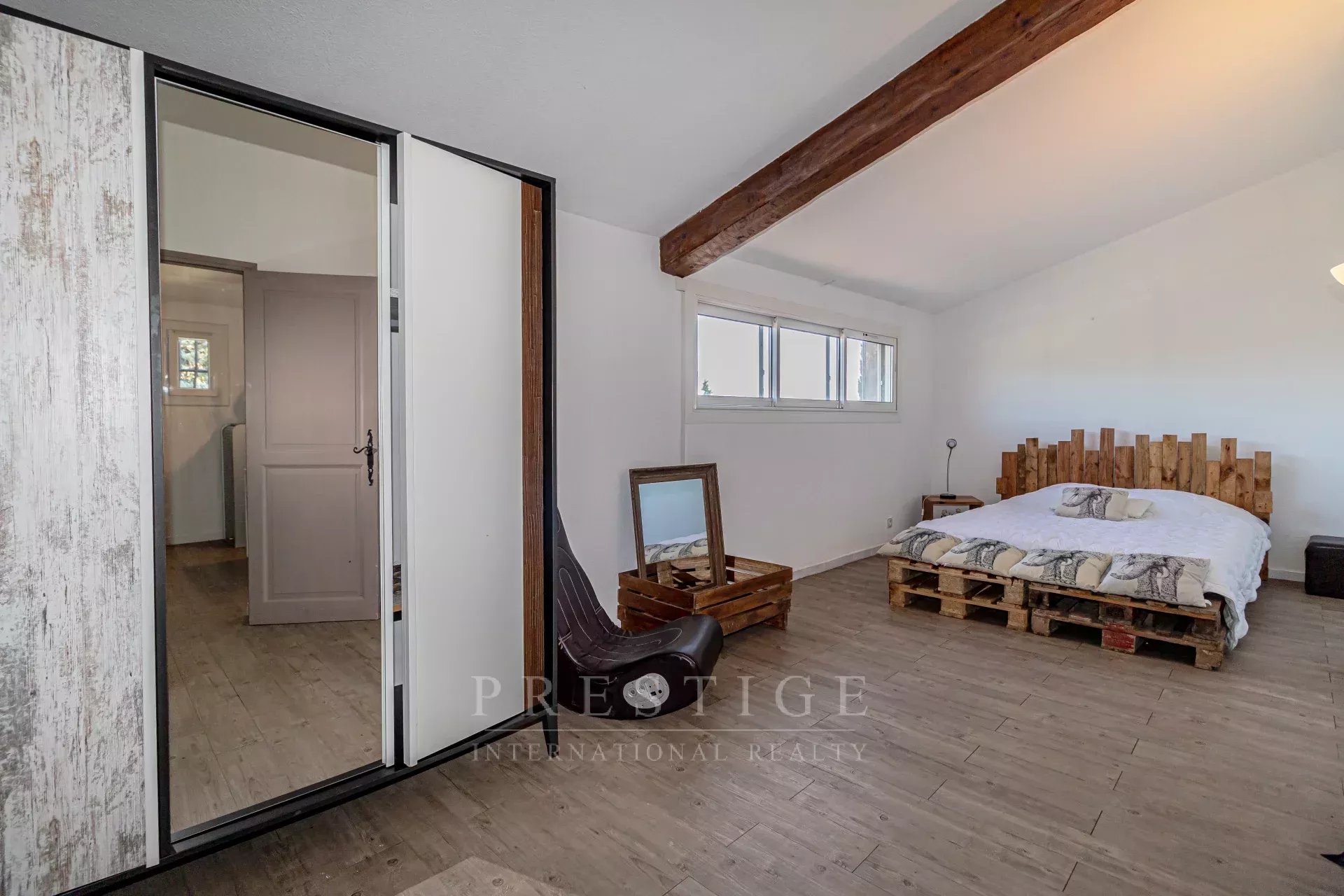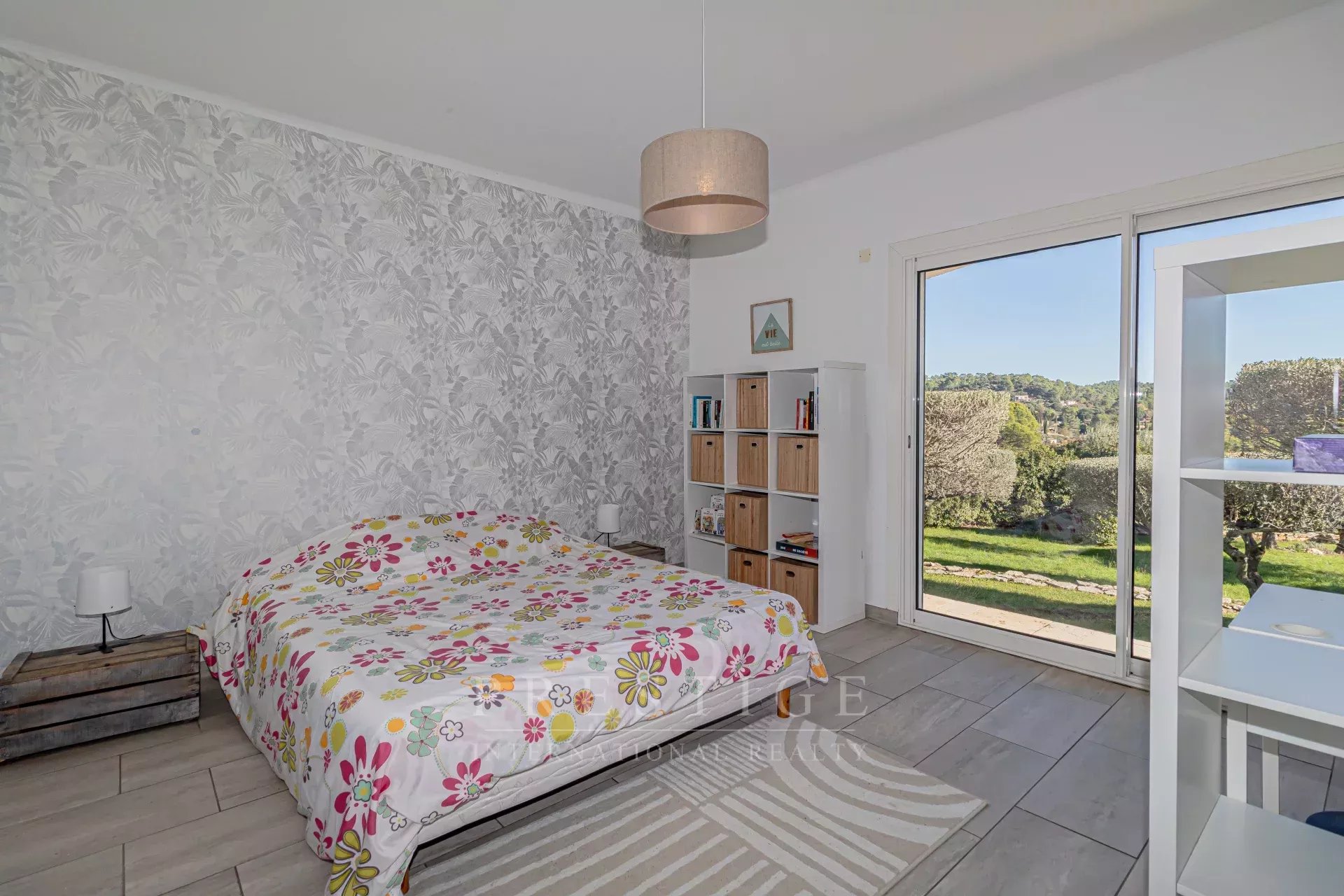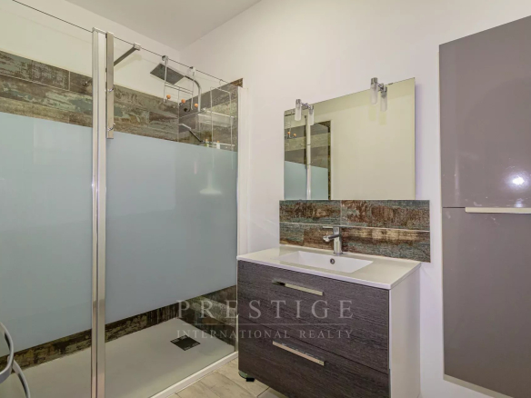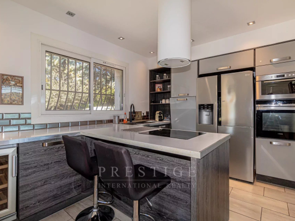 its ultra-modern open-plan kitchen offers state-of-the-art appliances and direct access to the bright and airy 53 sq m living room with its large sliding glass doors. The house is surrounded by three terraces (east, south, and north) totaling 130 sq m.